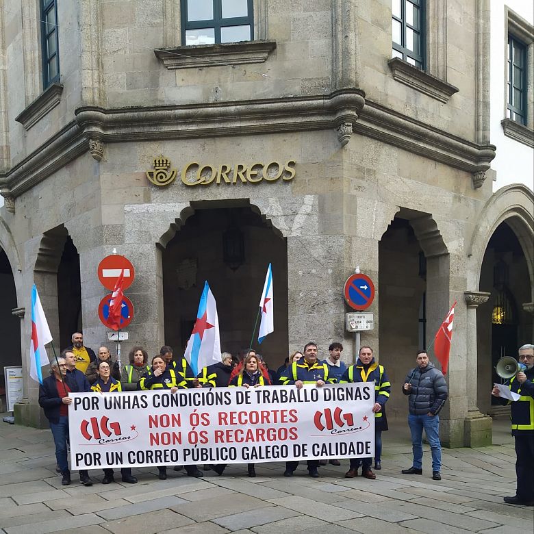 A CIG-Correos concentrouse esta tarde diante da oficina principal de Correos de Santiago de Compostela, na rúa do Franco, onde está a Xefatura Territorial, para denunciar a falta de persoal na unidade de reparto de Lalín pola falta de cobertura de vacantes e outro tipo de baixas e exixir que se garanta o servizo postal universal nesta localidade.