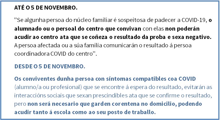 En contra do criterio que indica o SERGAS e aplica desde agora Educación tamén figuran as indicacións que proporciona o Ministerio de Sanidade, que claramente mantén o criterio de gardar corentena en casos de convivintes de persoas con sintomatoloxía susceptíbel de ser Covid á espera de resultados.