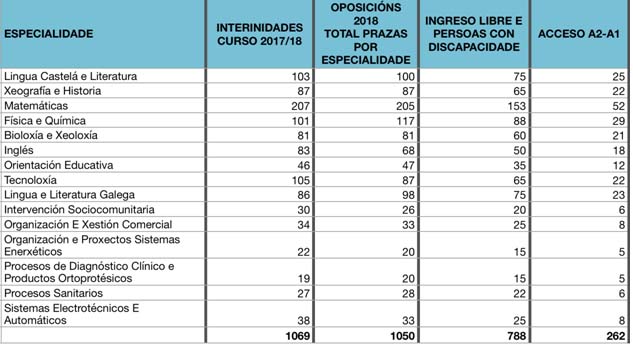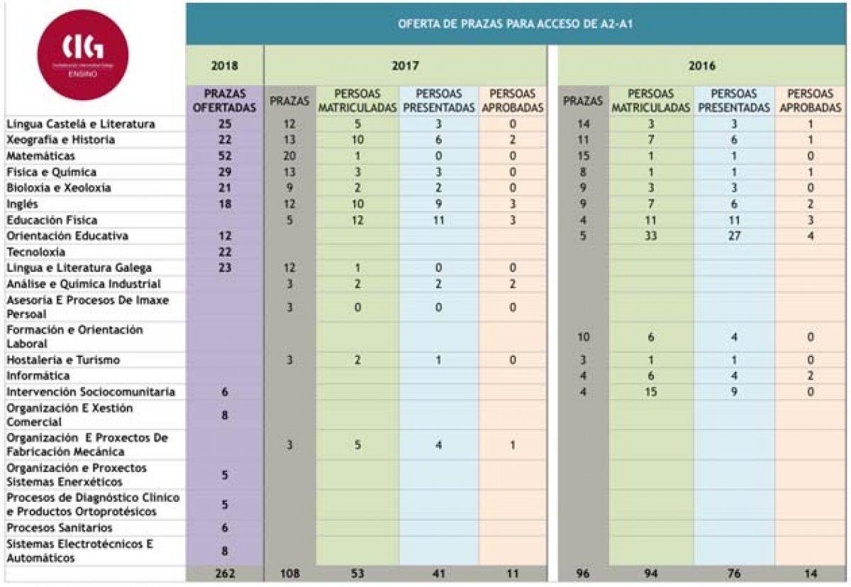 As cifras da oferta de emprego docente de 2018 inclúen 262 prazas de acceso do grupo A2 ao A1. Estas prazas, no caso de non se cubrir nesta quenda, non se acumulan ao acceso xeral, polo que desaparecen. Unha simple revisión da traxectoria tan só das dúas últimas convocatorias ofrece datos que “poñen absolutamente en cuestión” a estratexia da Consellaría para poder ofrecer unha cifra elevada de prazas nas oposicións e “deixan moi mal parada a propia administración”.