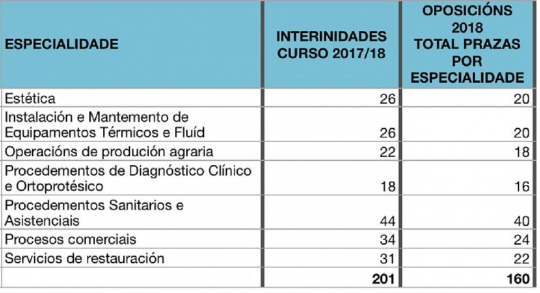 As cifras das prazas ofertadas, sumando todas as quendas (como se pode ver nas táboas anexas), dá en moitos casos un número idéntico ou moi próximo ao total de persoas que agora mesmo están con contrato de interinidade por curso completo. Isto implica que non se tivo en conta a posíbel incidencia das oposicións no persoal interino.