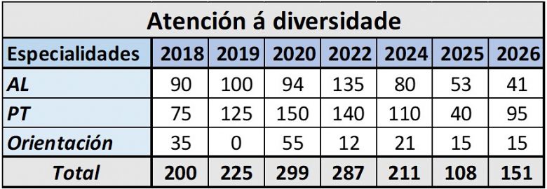 Tamén no que ten a ver coa atención á diversidade hai un abismo entre a versión oficial e a realidade, dado que neste mesmo período a deste ano é a segunda peor oferta. “Se contamos as prazas libres convocadas nas especialidades de Pedagoxía Terapéutica e Audición e Linguaxe no corpo de mestras e de Orientación no corpo de Secundaria suman só 151, a metade das que se convocaron en 2020 e tan só lixeiramente por riba das 108 do ano pasado. O resto de anos superaron sempre as 200”, explicou.
