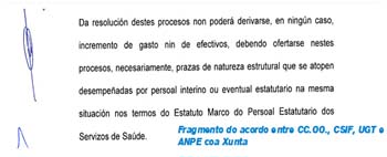 En calquera caso, a posibilidade de recuperar as prazas perdidas nestes momentos non existe porque o Acordo de Mantemento do Emprego asinado pola Xunta e polas organizacións sindicais CC.OO, UGT, CSIF e ANPE, tal e como se pode comprobar no seu texto literal, impide o aumento de persoal.