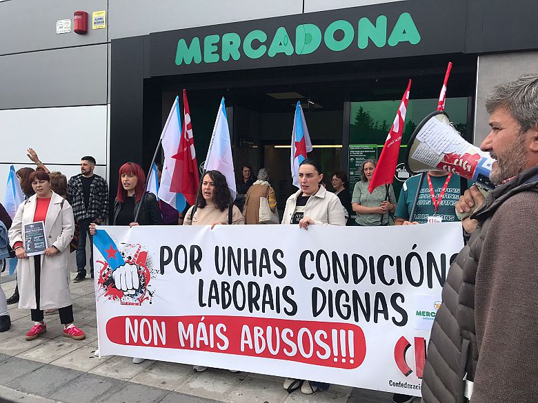 A CIG-Servizos realizou este xoves catro mobilizacións simultáneas na Coruña, Vigo, Ourense e Monforte diante doutros tantos supermercados de Mercadona. As protestas desenvólvense coincidindo coa celebración na Audiencia Nacional en Madrid do xuízo de impugnación do convenio colectivo de Mercadona, tras a demanda presentada pola CIG.