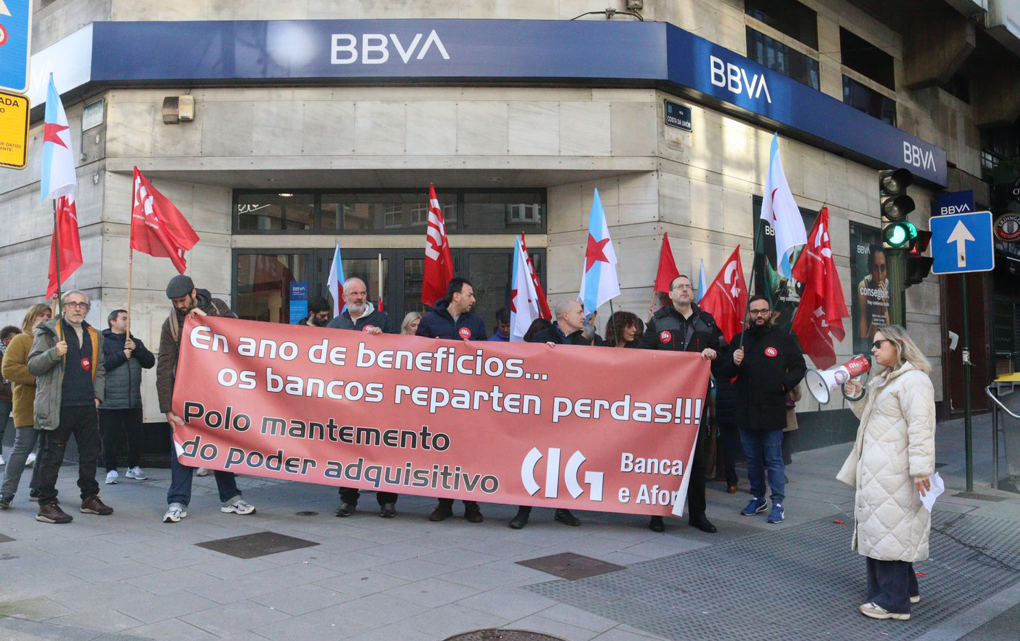 A protesta iniciouse diante dunha oficina de BBVA na rúa Juan Flórez e proseguiu con concentracións en diferentes sucursais de Abanca, Banco Santander e Banco Sabadell até rematar no Cantón. A xornada de mobilización convócase con motivo da actual negociación dos convenios CECA e AEB (de ámbito estatal) e terá continuidade nas próximas semanas.