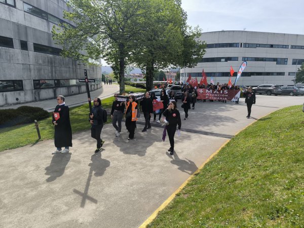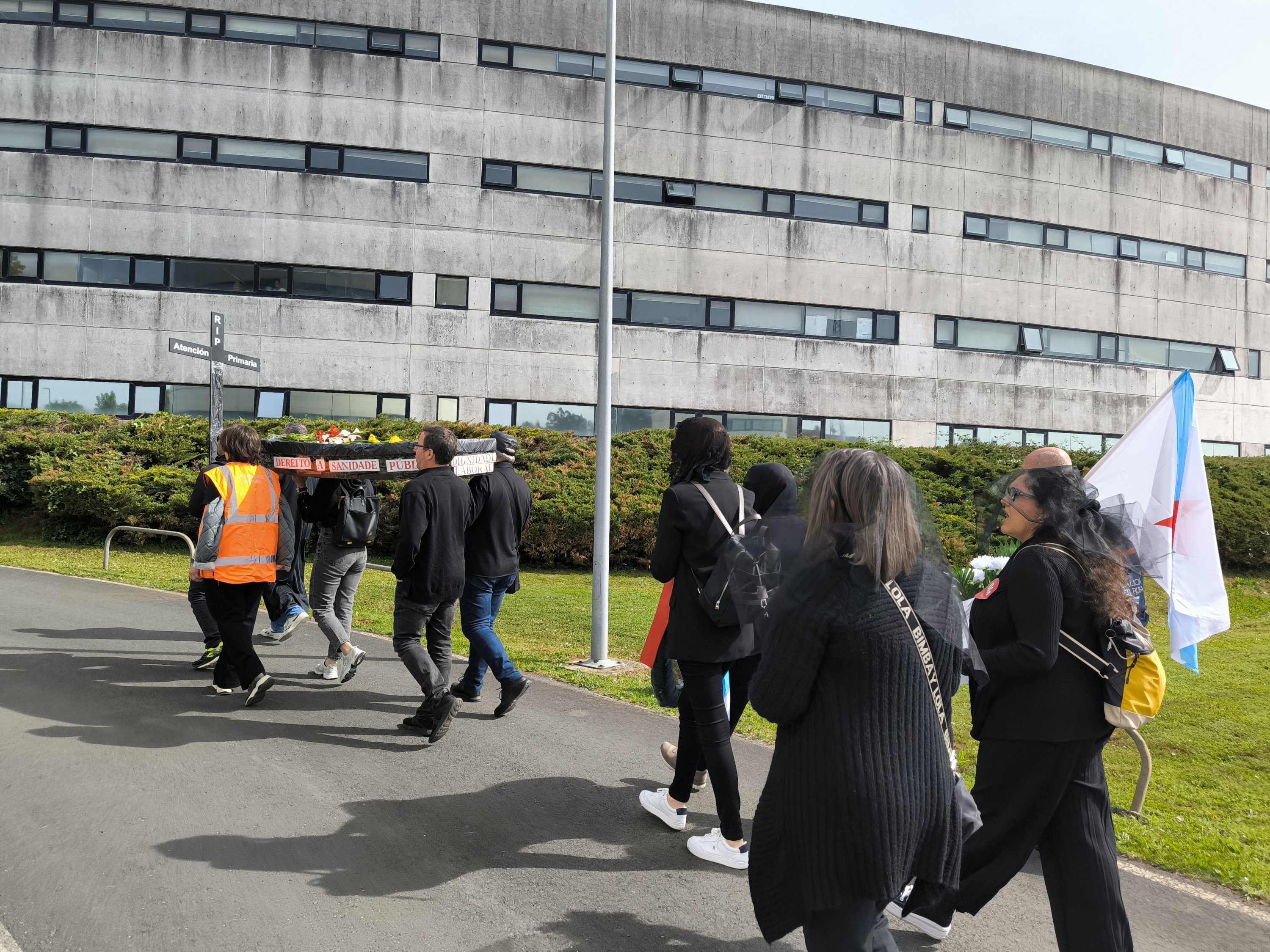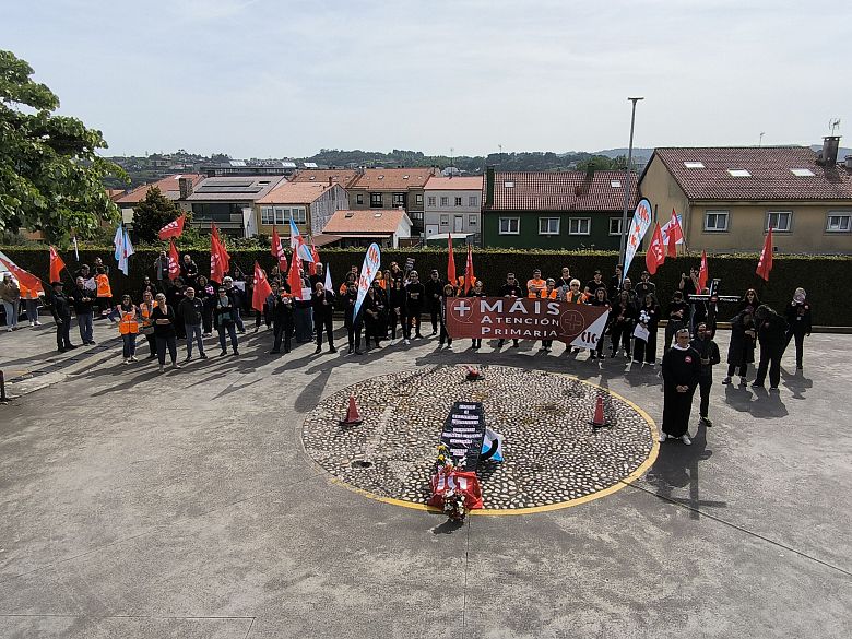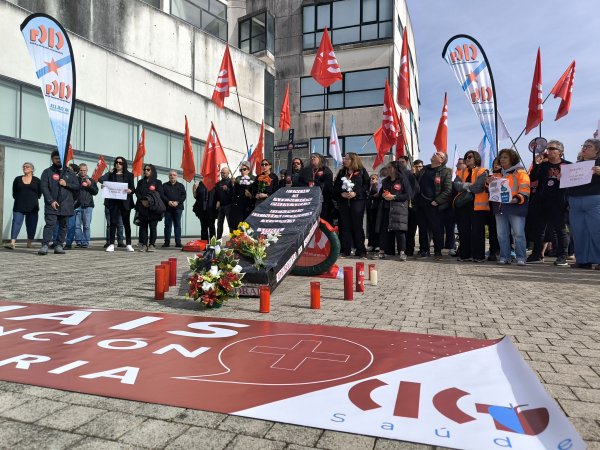 “A Atención Primaria finou despois dunha longa agonía”. Come este epitafio, e coa compaña de ramos de flores, prantos e mesmo pregarias, a CIG-Saúde representou este xoves o enterro da Atención Primaria ás portas da Consellaría de Sanidade. Unha acción enmarcada na nova xornada de folga (a sétima convocada pola central nacionalista dende o mes de novembro) para reclamar melloras nas condicións de traballo e medidas estruturais que eviten o colapso dos centros de saúde e dos PAC.