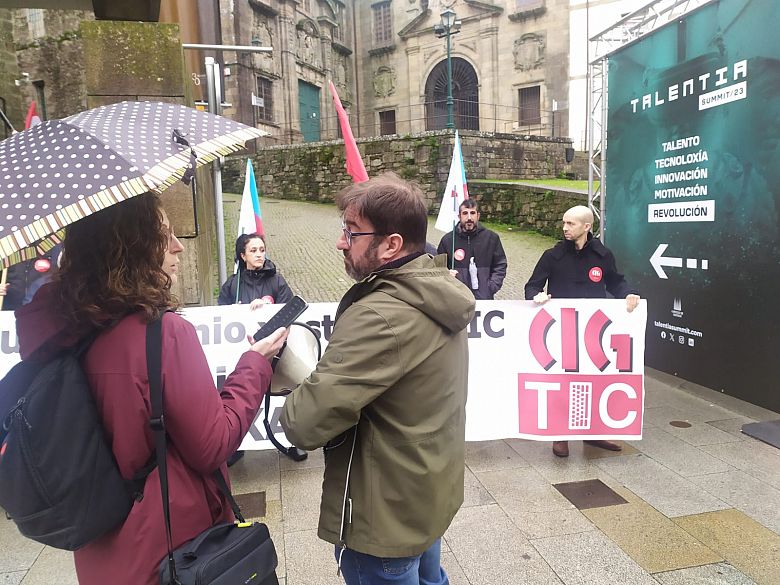 Delegados e delegadas da CIG-TIC concentráronse esta mañá diante do CGAC, en Compostela, para reclamar un convenio galego para as empresas TIC. Reiteran así a súa proposta, que xa conseguira abrir a mesa negociadora do sector no Consello Galego de Relacións Laborais no ano 2018.