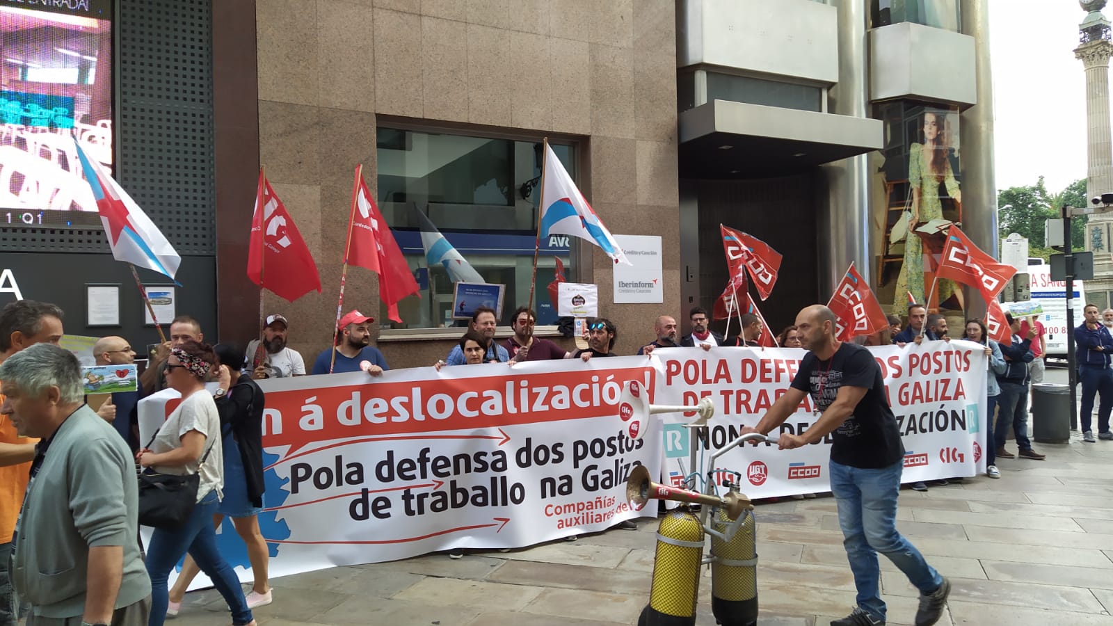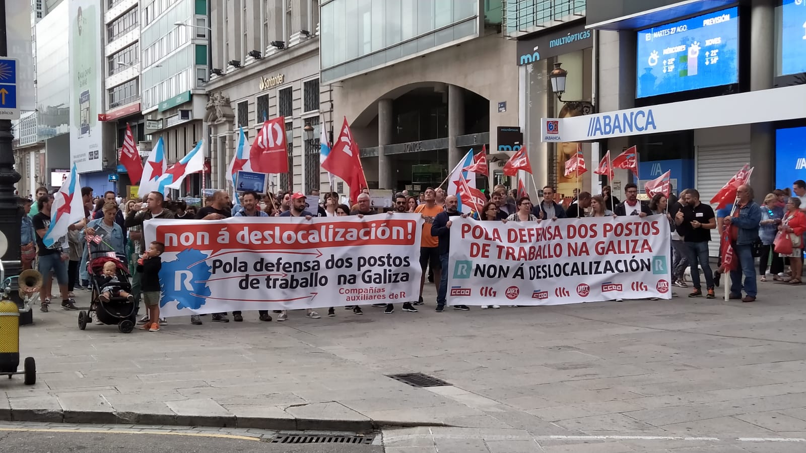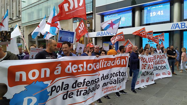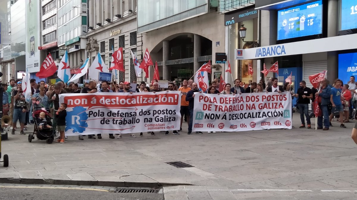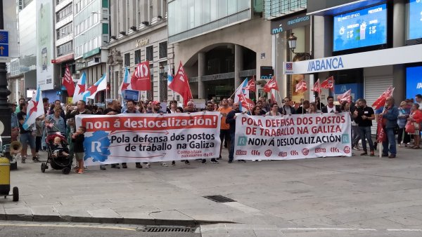 Dentro do calendario de mobilizacións acordado para este mes de agosto, os traballadores e as traballadoras de COMFICA e Indra, contratas de R, desenvolven este martes unha nova xornada de folga de 24 horas e un paro laboral de 3 horas, respectivamente, en defensa dos empregos e contra o proceso de traslado de servizos iniciado por Euskaltel, propietaria de R Cable. Para dar visibilidade as súas reivindicacións e informar á cidadanía das consecuencias desta decisión empresarial, o persoal realizou unha concentración esta tarde diante do edificio que R ten na rúa Real da Coruña.