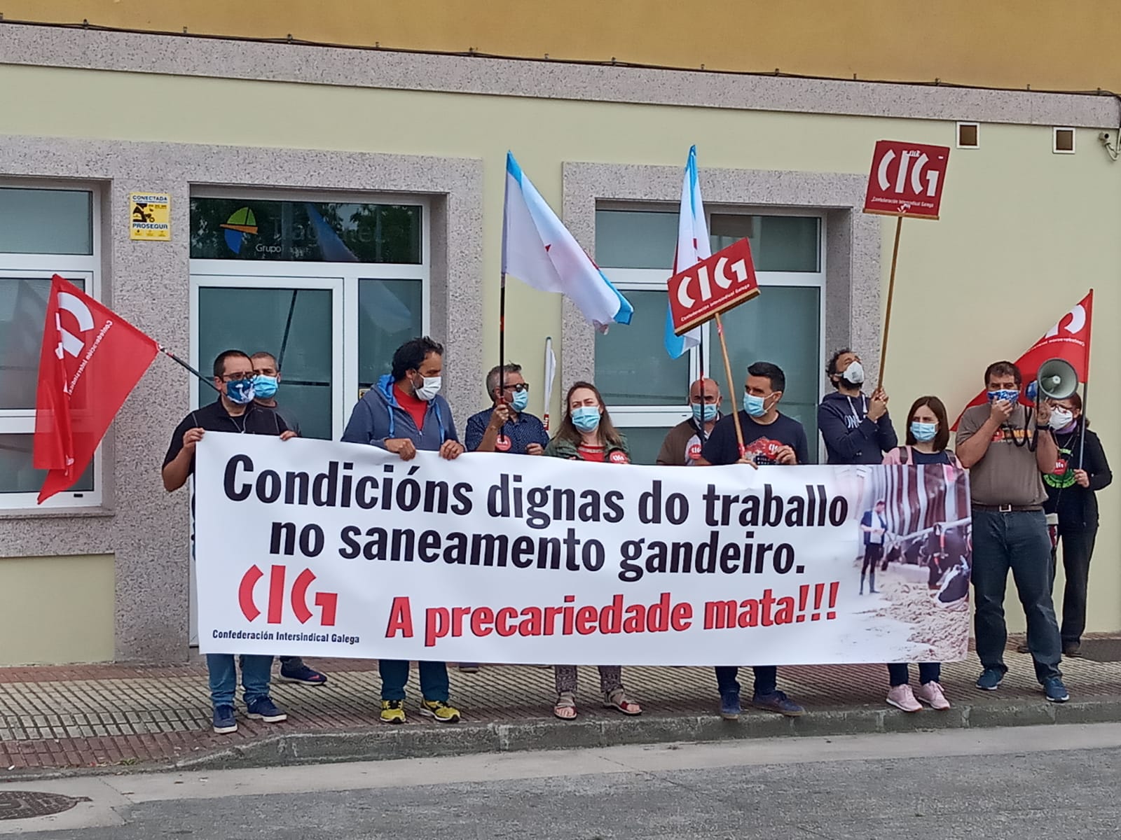 A CIG realizou este xoves unha concentración diante das oficinas de Tragsatec en Lugo para esixir de melloras de seguridade para o persoal veterinario e que non se repitan accidentes como o que lle custou a vida a un compañeiro mentres estaba realizando os labores de saneamento gandeiro nas Nogais.