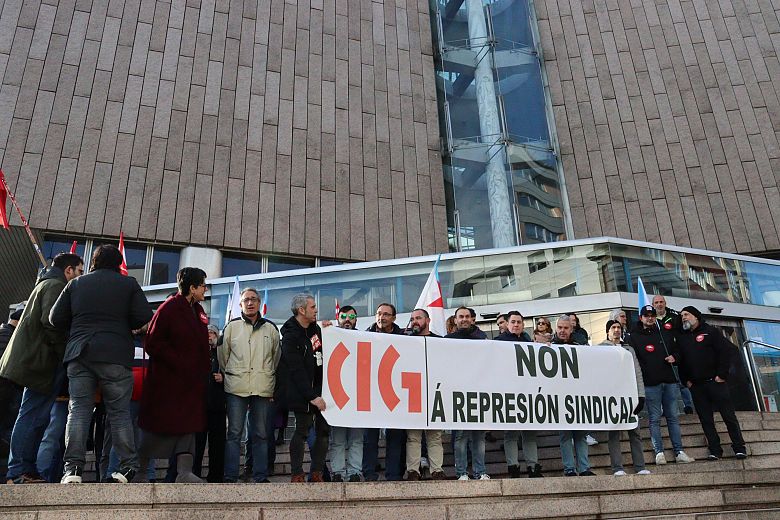 Delegadas e delegados da CIG concentráronse esta mañá diante dos xulgados da Coruña en rexeitamento á represión sindical e en solidariedade co traballador do metal que está sendo xulgado pola súa participación nas mobilizacións que o sector realizou en 2022 en defensa dun convenio colectivo digno.