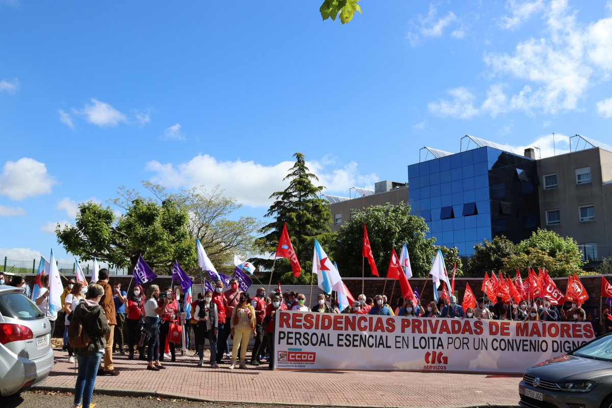 Delegadas e delegados da CIG, CCOO e UGT concentrábanse esta mañá diante da residencia de maiores que DomusVi ten en Santiago de Compostela, na primeira das mobilizacións convocadas en demanda da negociación do convenio colectivo nun sector que viviu con especial dureza as consecuencias da pandemia.