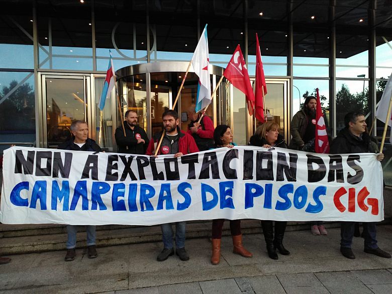A CIG-Servizos de Compostela continuou este venres, cunha concentración diante do Hotel Eurostar GH, coa súa campaña de denuncia pública da situación de explotación das traballadoras da limpeza (camareiras de piso) dos hoteis da capital de Galiza e en demanda de que se rexan polo convenio de hostalería. A anterior mobilización, no mes de outubro, celebrárase diante do Hotel Exe Área Central, onde foi despedida unha traballadora que prestaba servizos a través dunha subcontrata (GRUPO CONSTANT) como camareira de pisos.
