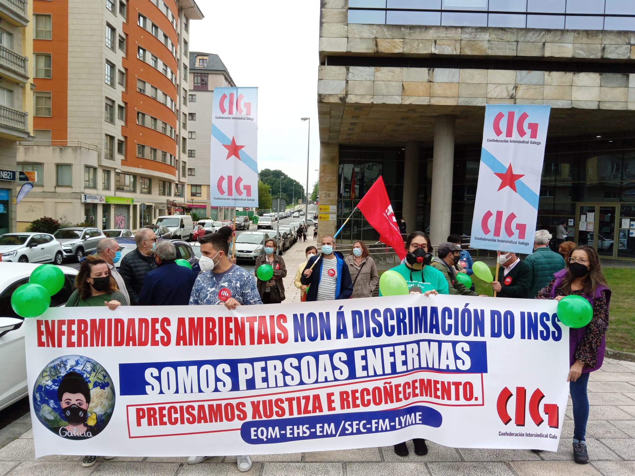 A asociación de persoas afectadas por enfermidades ambientais, Asociación SQM-EHS Galiza, e a CIG ralizaron este venres unha concentración diante da sede do INSS de Lugo para demandar xustiza e o recoñecemento destas doenzas por parte da administración á hora de avaliar a estas persoas. Con esta mobilización quérese visibilizar a dramática situación destas persoas e denunciar o trato discriminatorio que sofren.
