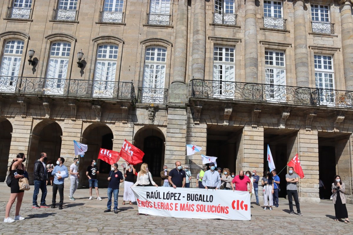 Condutores da liña Santiago aeroporto concentráronse esta mañá diante do concello de Santiago, na praza do Obradoiro, para reclamar do goberno municipal, e nomeadamente do seu alcalde, Xosé Sánchez Bugallo, unha solución inmediata á súa situación. Denunciaron ademais que malia o compromiso adquirido por unanimidade no pleno municipal nada saben das xestións que Bugallo se comprometeu a facer e acusárono de actuar ao ditado de Monbus.