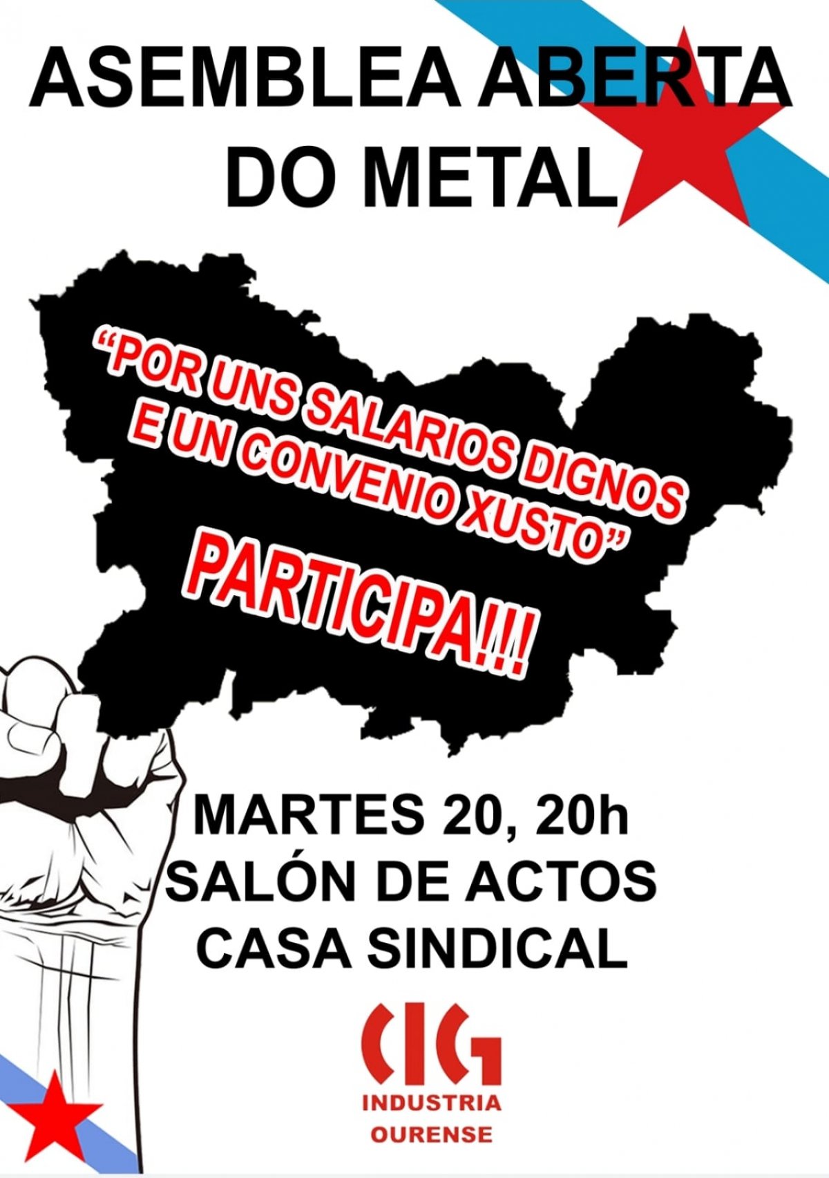 CIG, CCOO e UXT veñen de anunciar a convocatoria dunha asemblea aberta conxunta do sector do Metal da provincia de Ourense para o vindeiro martes día 20 de setembro, ás 20:00 horas, no Salón de Actos da Casa Sindical.