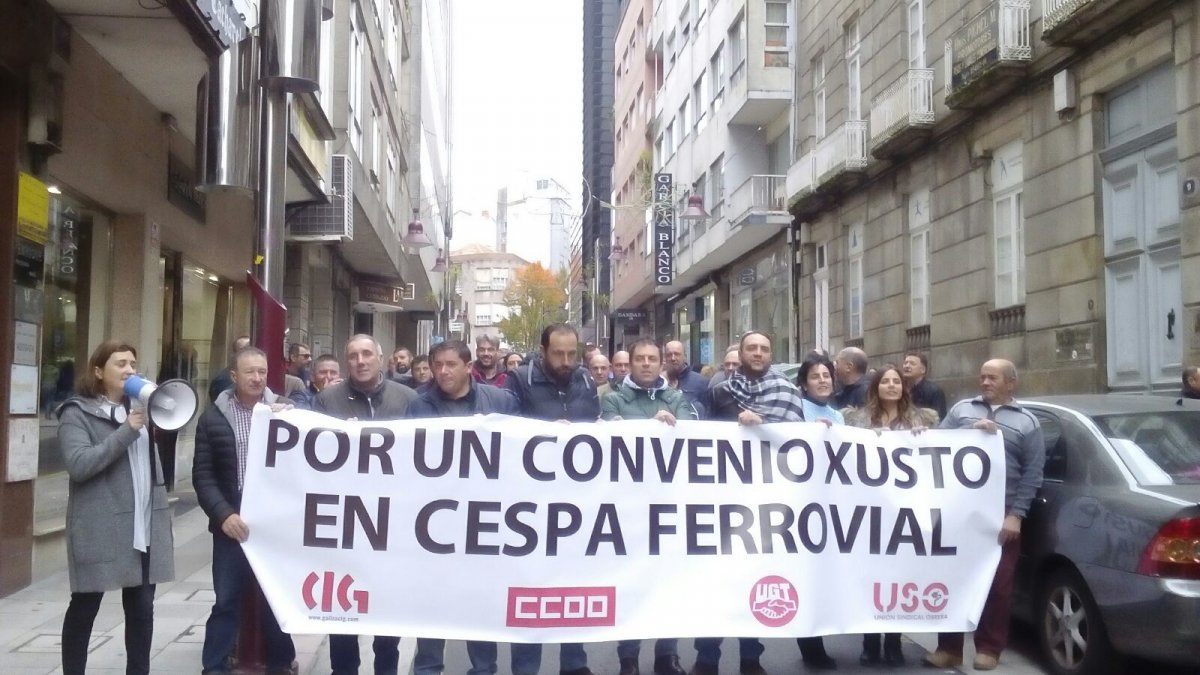 Os empregados/a de Cespa acordaron convocar a folga na asemblea celebrada esta mañá xusto antes de que dese inicio unha nova mobilización en demanda dun convenio colectivo digno.