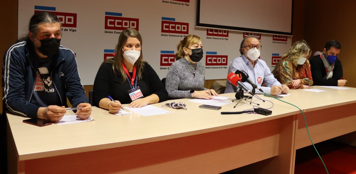 Unha representación de cada unha das tres centrais compareceu esta mañá en rolda de prensa en Vigo para explicar os detalles da decisión. Por parte da CIG, participaron a secretaria nacional e o secretario de Negociación Colectiva da federación de Servizos, Transi Fernández e Adolfo Naia, ademais da responsábel do sector de residencias privadas da CIG-Servizos de Ferrol, Beatriz Fernández.