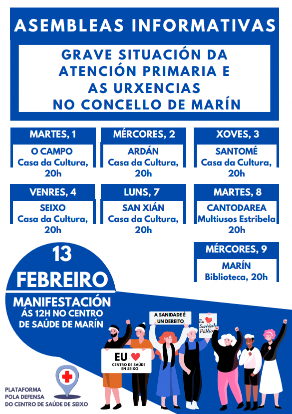 Finalmente, convidan ao persoal sanitario, especialmente o do centro de saúde de Seixo e de Marín, “porque sen persoal non hai sanidade pública de calidade para a veciñanza, hai máis sobrecarga e esgotamento dos profesionais e unha atención primaria ao límite.”