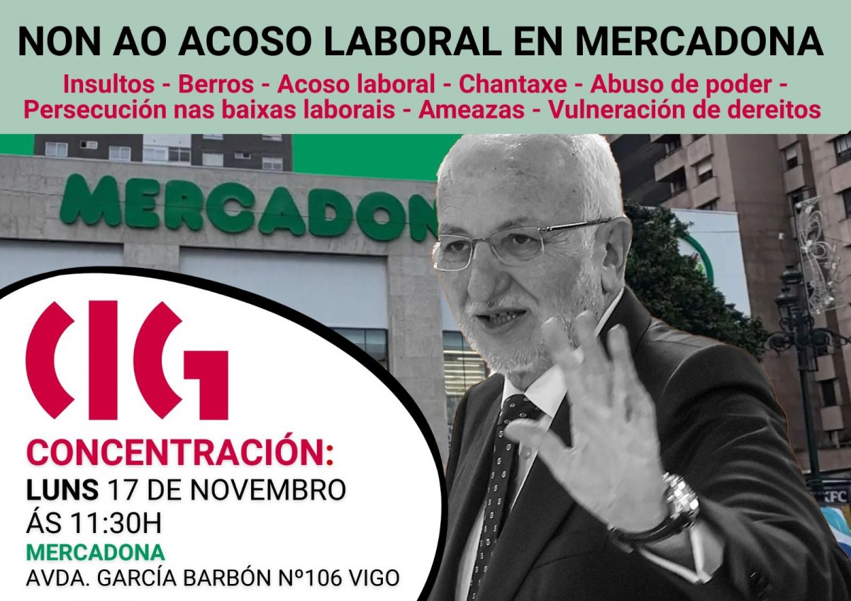 A CIG-Servizos continúa coa campaña ‘Un segredo a voces’ coa que está a denunciar a política de acoso laboral que aplica Mercadona contra os cadros de persoal, con insultos, berros, chantaxes, abusos de poder e vulneración de dereitos. Nesta ocasión ten convocada unha concentración en Vigo este luns día 17 ás 11:30 horas, coincidindo coa inauguración dun supermercado da empresa na avenida García Barbón, 106.