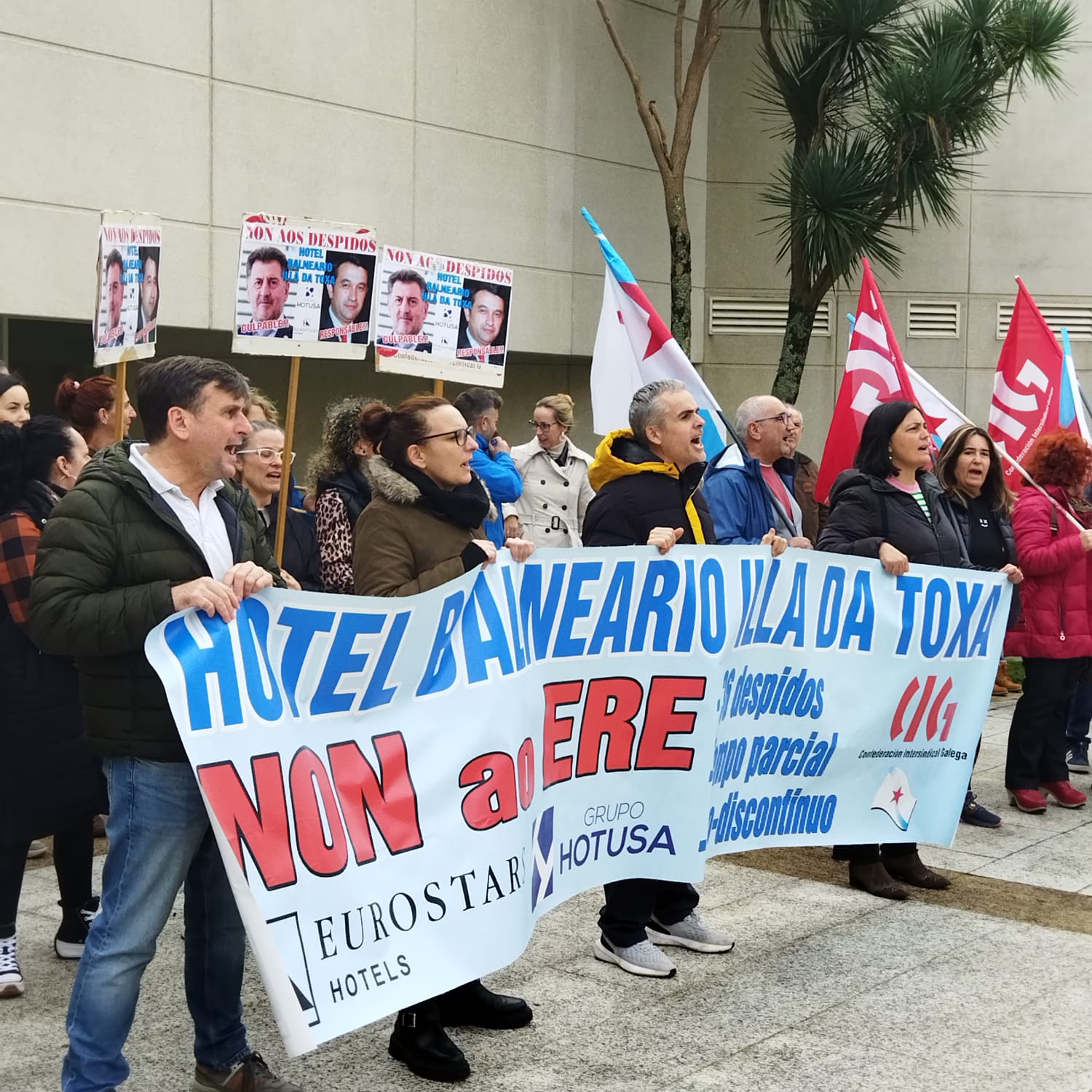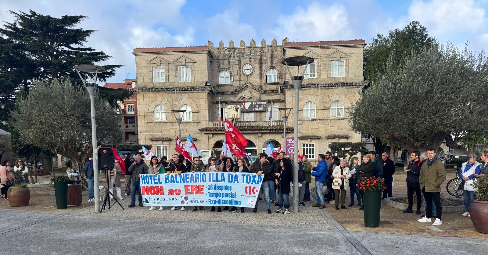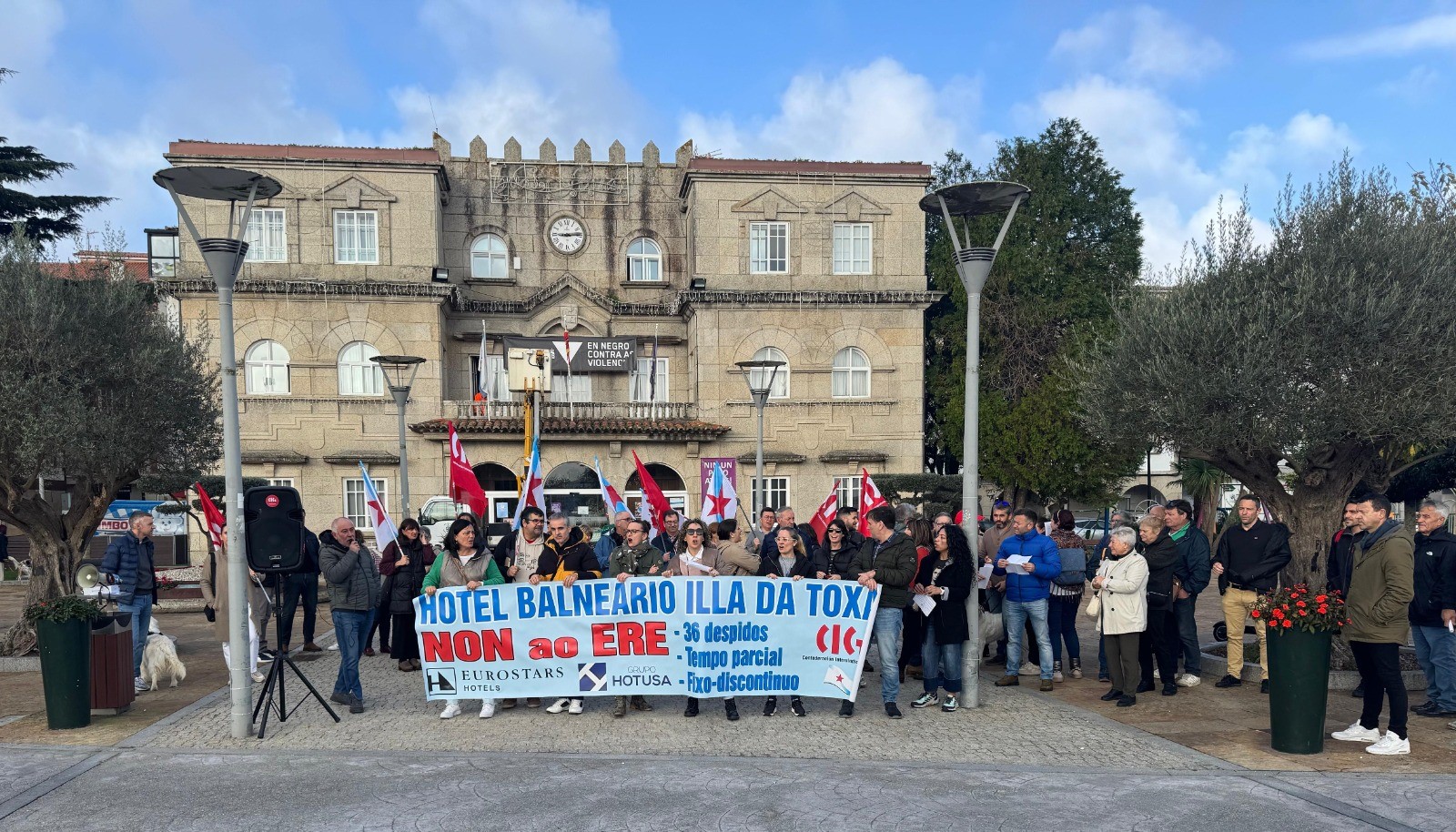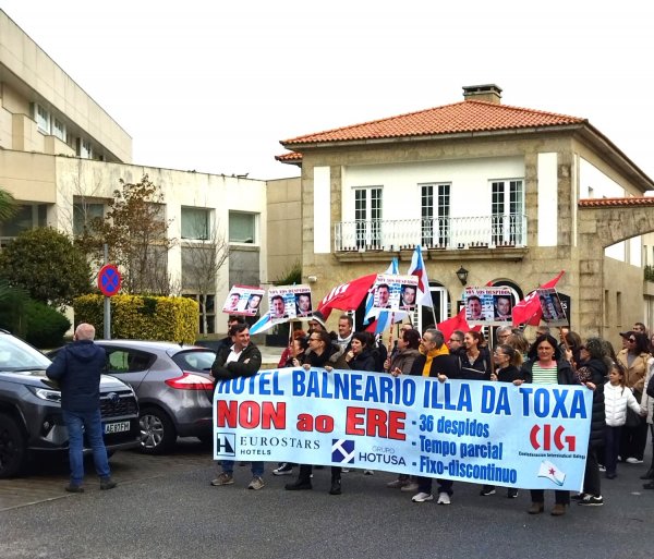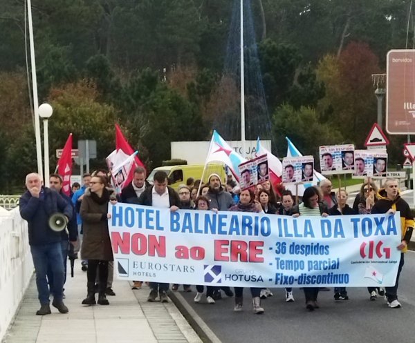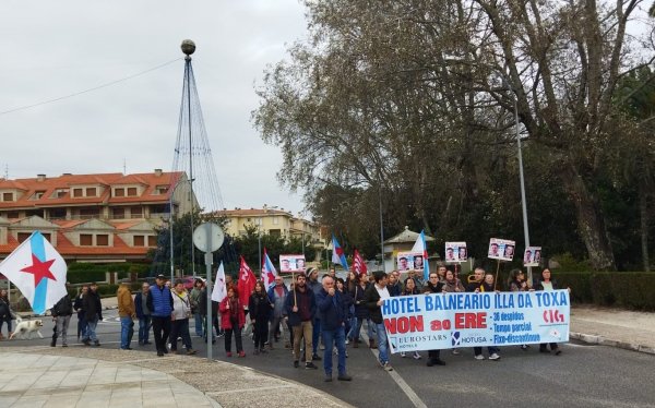 O comité de empresa do Hotel Balneario Eurostars Illa da Toxa, con maioría da CIG, vén de anunciar a convocatoria de cinco xornadas de folga os vindeiros días 6, 7, 8, 10 e 12 de decembro para reclamar a retirada do ERE para 36 persoas traballadoras e o mantemento de todos os empregos. Ao mesmo tempo, o cadro de persoal continuou coas protestas o pasados venres día 29 e sábado 30, cunha concentración diante do Concello do Grove e cunha manifestación.