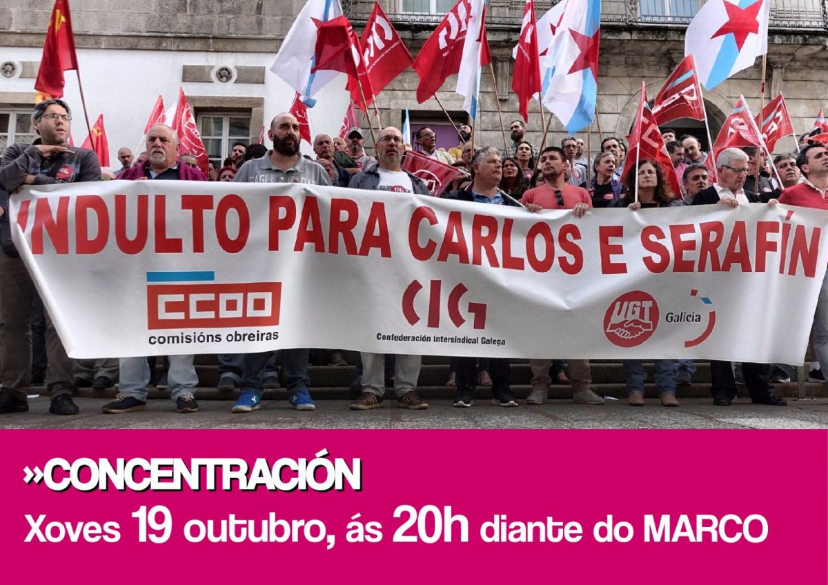 As rúas de Vigo acollen este xoves 19 unha nova mostra de solidariedade con Carlos Rivas e Serafín Rodríguez, os dous traballadores condenados a tres anos de prisión por participar nunha folga. As centrais CIG, CCOO e UGT convocan unha concentración diante do Marco ás 20:00 horas para reclamarlle ao Goberno español que lles conceda un indulto que evite a súa entrada en prisión. Porque defender a clase traballadora non é delito!