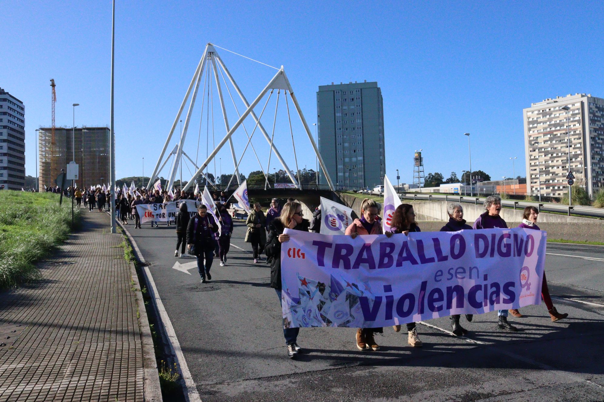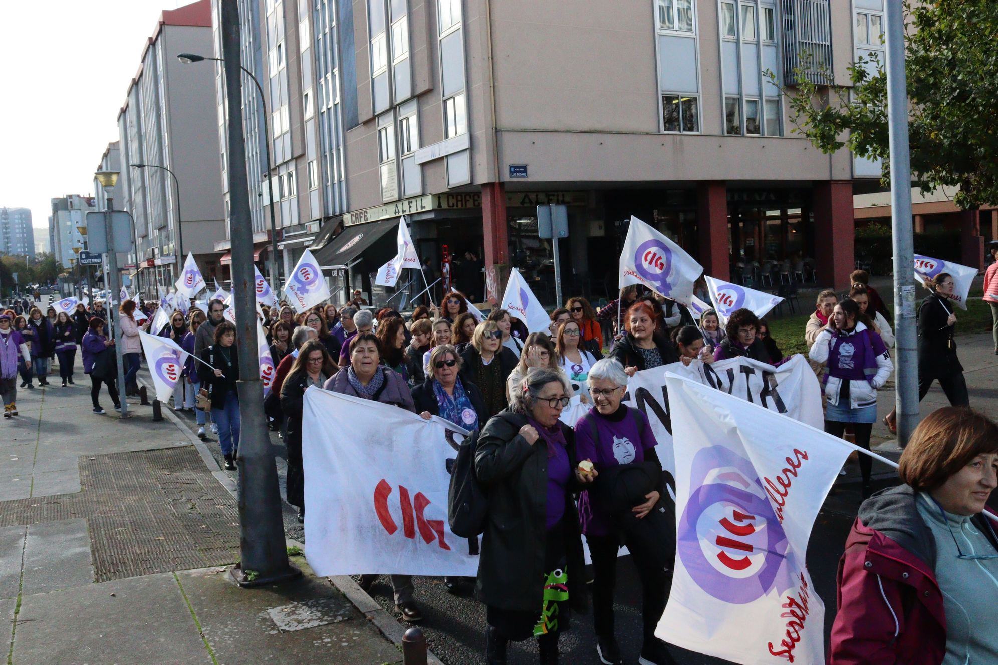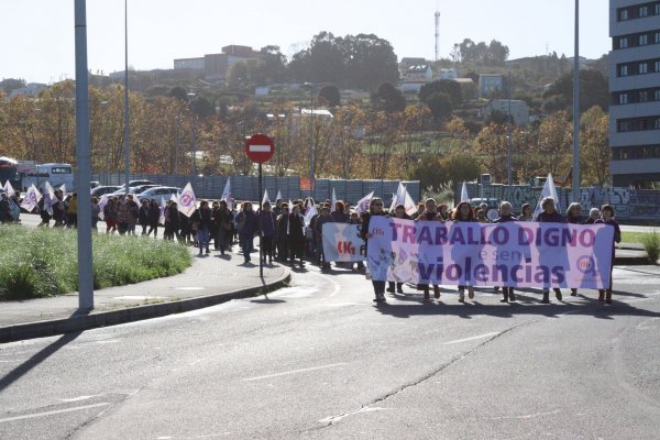 Delegadas da CIG manifestáronse este venres dende o edificio sindical na Coruña até a Confederación de Empresarios/as para denunciar a actitude de permisividade da patronal ante as situacións de acoso que padecen moitas mulleres nas súas empresas. A mobilización enmárcase na campaña da secretaría das Mulleres con motivo do 25 de Novembro, Día internacional para a eliminación da violencia contra as mulleres, que este ano se desenvolve baixo o lema "Traballo digno e sen violencias".