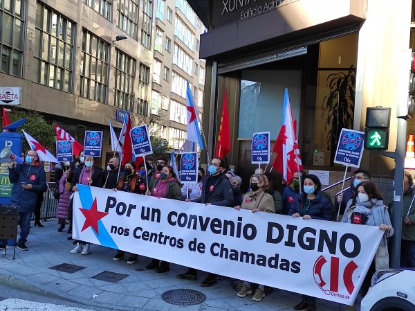 Delegados/as da CIG no sector dos centros de chamadas mobilizáronse hoxe diante da delegación da Xunta de Galiza en Ourense para reclamar un convenio digno para o sector e denunciar a súa situación laboral e os nulos avances na mesa de negociación.