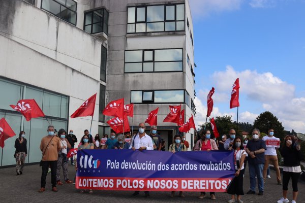 Delegados e delegadas da CIG-Saúde das distintas áreas sanitarias concentráronse esta mañá diante das dependencias do SERGAS, en San Lázaro, para reclamar a restitución dos salarios do persoal conxelados desde o ano 2010. Unha concentración na que se fixo entrega, ademais, dun escrito dirixido ao SERGAS lembrando as súas demandas e a obriga legal da administración de contestar aos requirimentos de información da Valedora do Pobo.