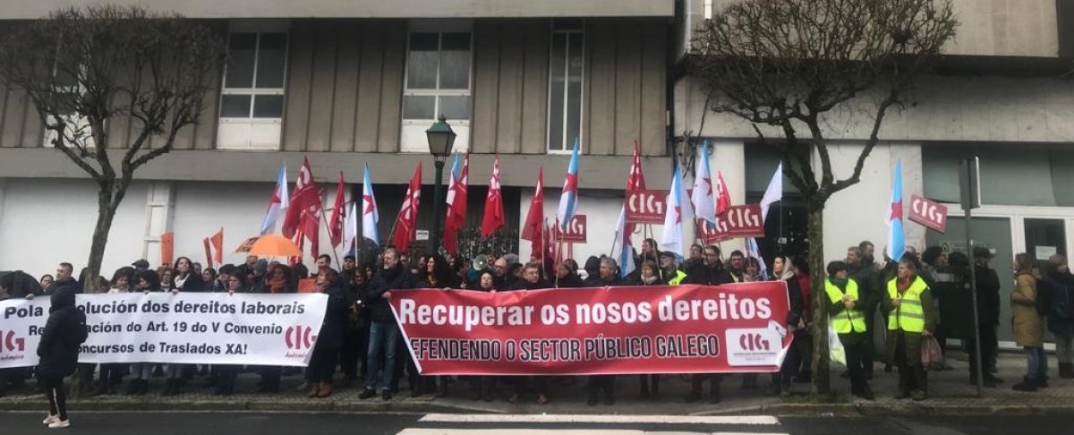 Delegados e delegadas da Área Pública da CIG (CIG-Administración, CIG-Ensino e CIG-Saúde) concentráronse este martes diante do Parlamento de Galiza, coincidindo co debate dos orzamentos para o ano 2020, para manifestar o seu rexeitamento a unhas contas que non contemplan nin a recuperación dos dereitos que en material salarial, laboral e social lles foron roubados, nin a recuperación dos servizos públicos que están sendo desmantelados por mor dos recortes impostos na última década.