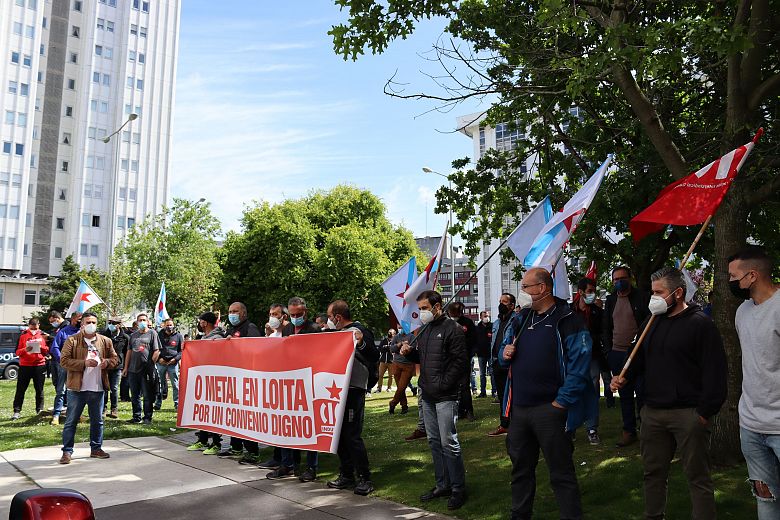 Delegados e delegadas da CIG no sector do metal concentráronse na mañá deste venres diante da sede da Confederación de Empresarios/as da Coruña para amosar o seu rexeitamento á proposta da patronal para o convenio provincial de siderometal, que non responde ás demandas trasladadas pola representación sindical.