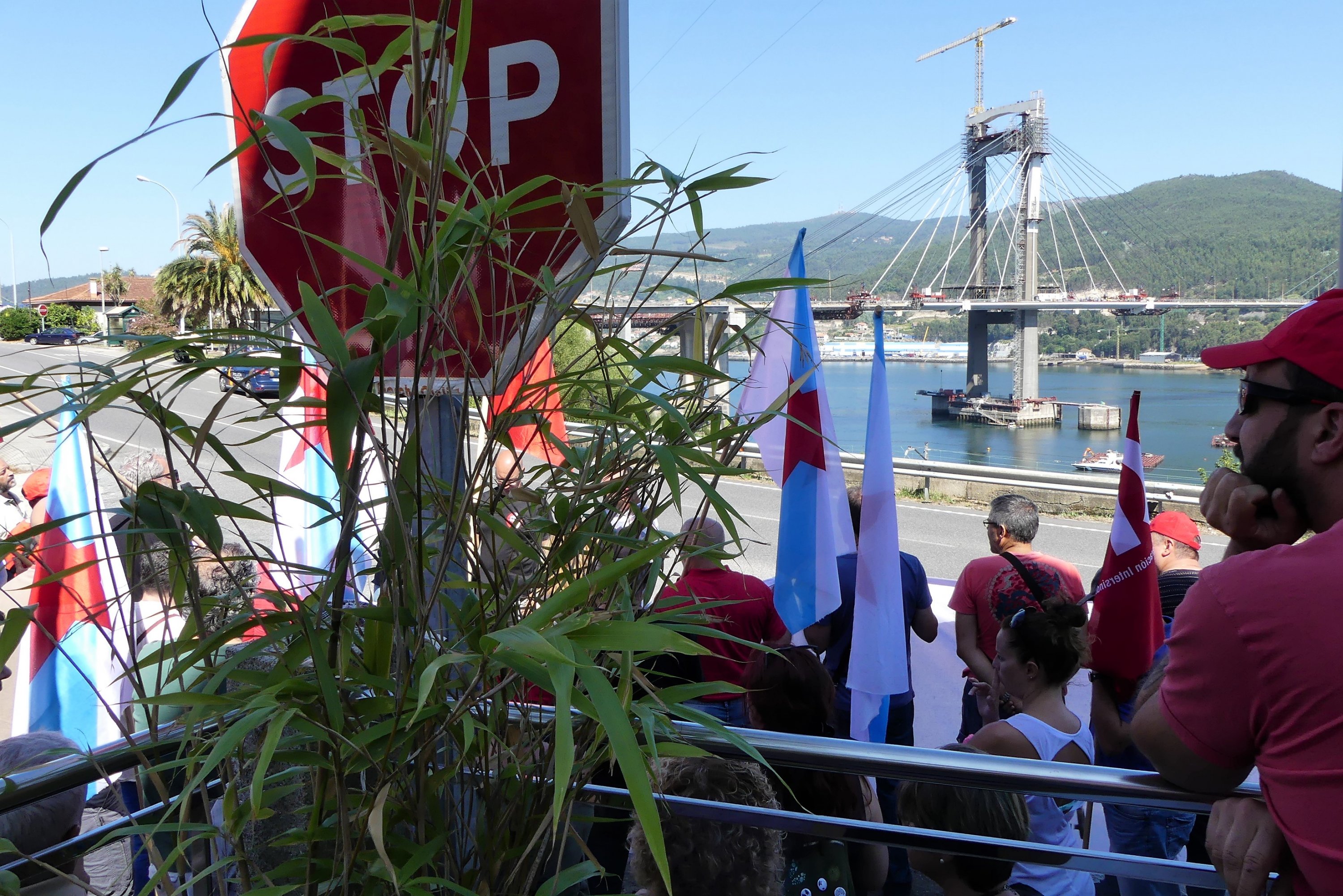 Mentres, o grupo máis numeroso permanecía concetrado ás portas do edificio, onde se despregaron varias faixas contra a explotación laboral e e fraude á Facenda e á Seguridade Social que están a cometer as compañías encargadas dos traballos de ampliación da ponte. Alí permaneceron ate pouco despois das 12.00 horas, cando rematou a xuntanza que mantiveron o xerente e o responsábel de saúde laboral da UTE cos representantes sindicais que accederon ao interior das oficinas. Tanto a entrada como a permanencia nas instalacións transcorreu sen ningún tipo de incidente.
