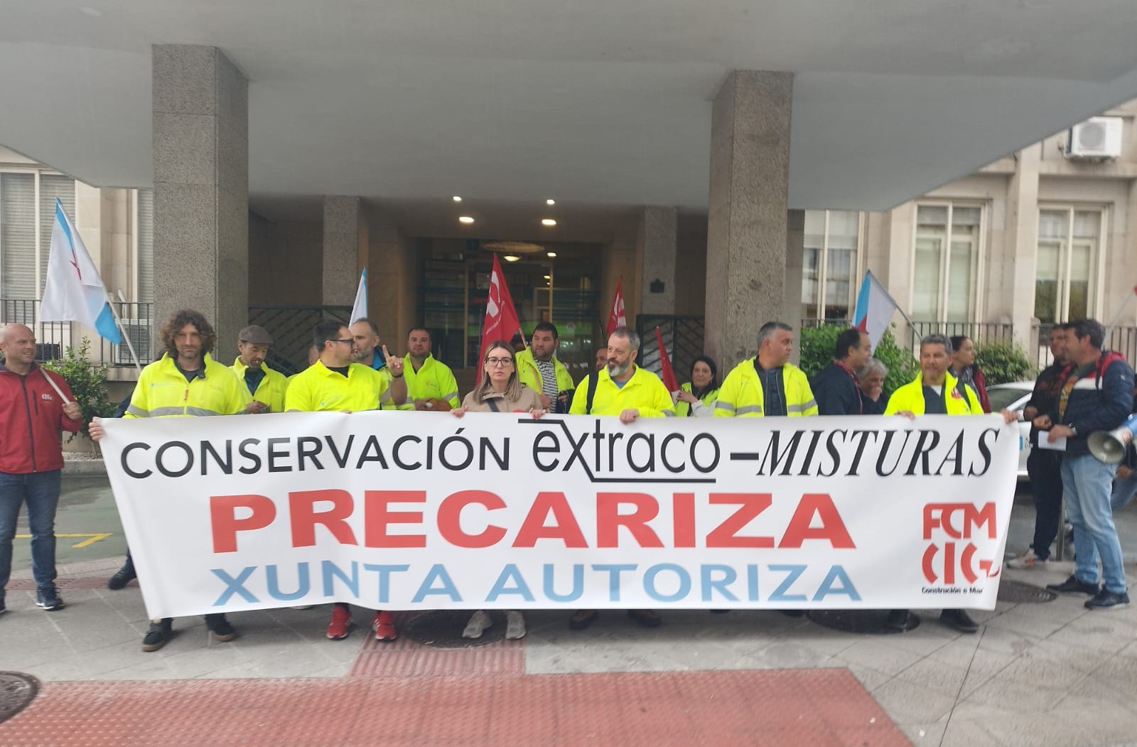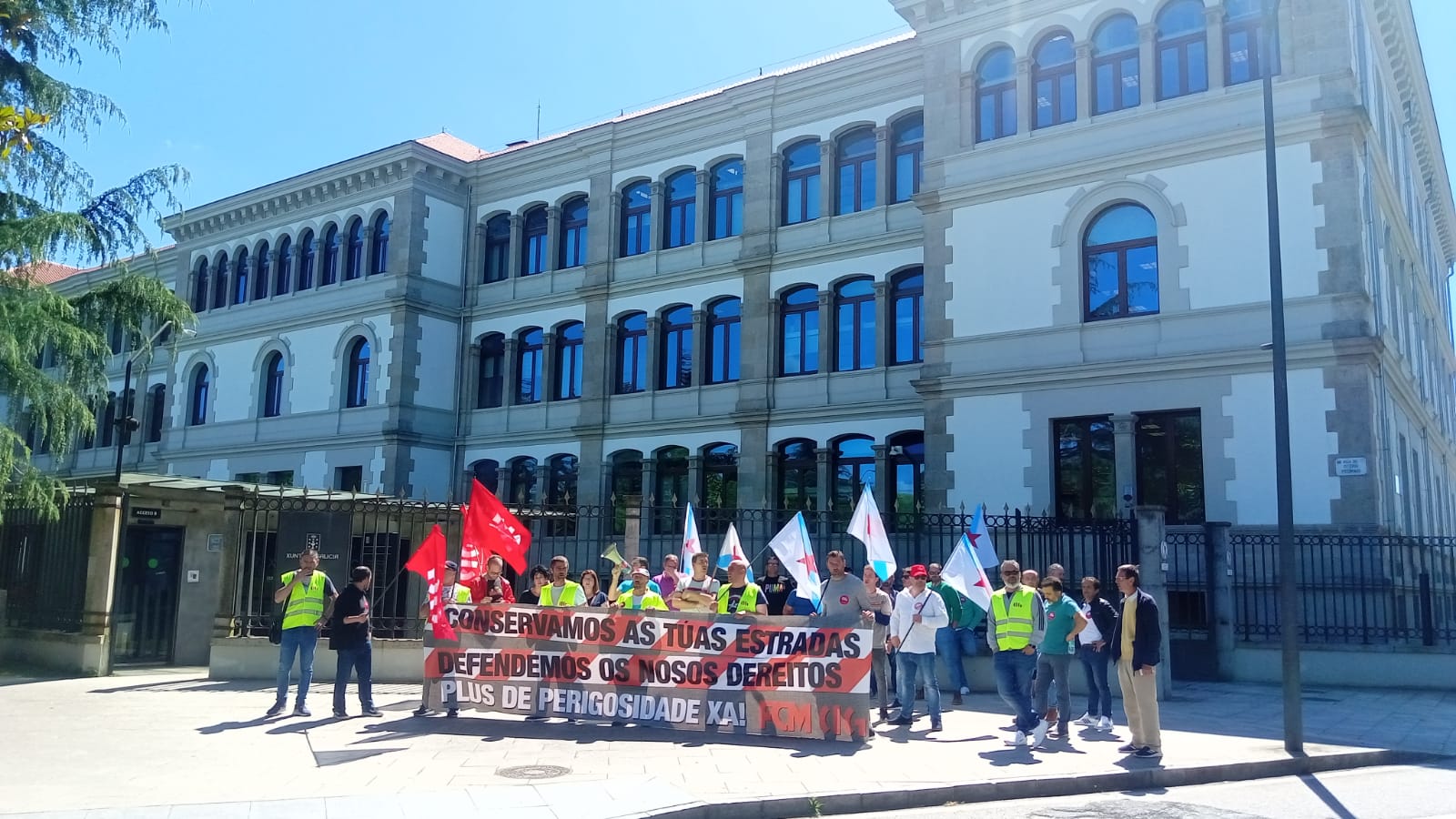 Delegados da CIG nas empresas de mantemento e conservación das vías concentráronse este martes diante do edificio da Xunta en San Caetano para esixir das concesionarias e das administracións públicas que garantan unhas condicións laborais dignas no sector e, nomeadamente, para que se lle recoñeza a aplicación do plus de perigosidade estabelecido nos convenios de construción, tendo en conta o risco inevitábel do seu traballo.