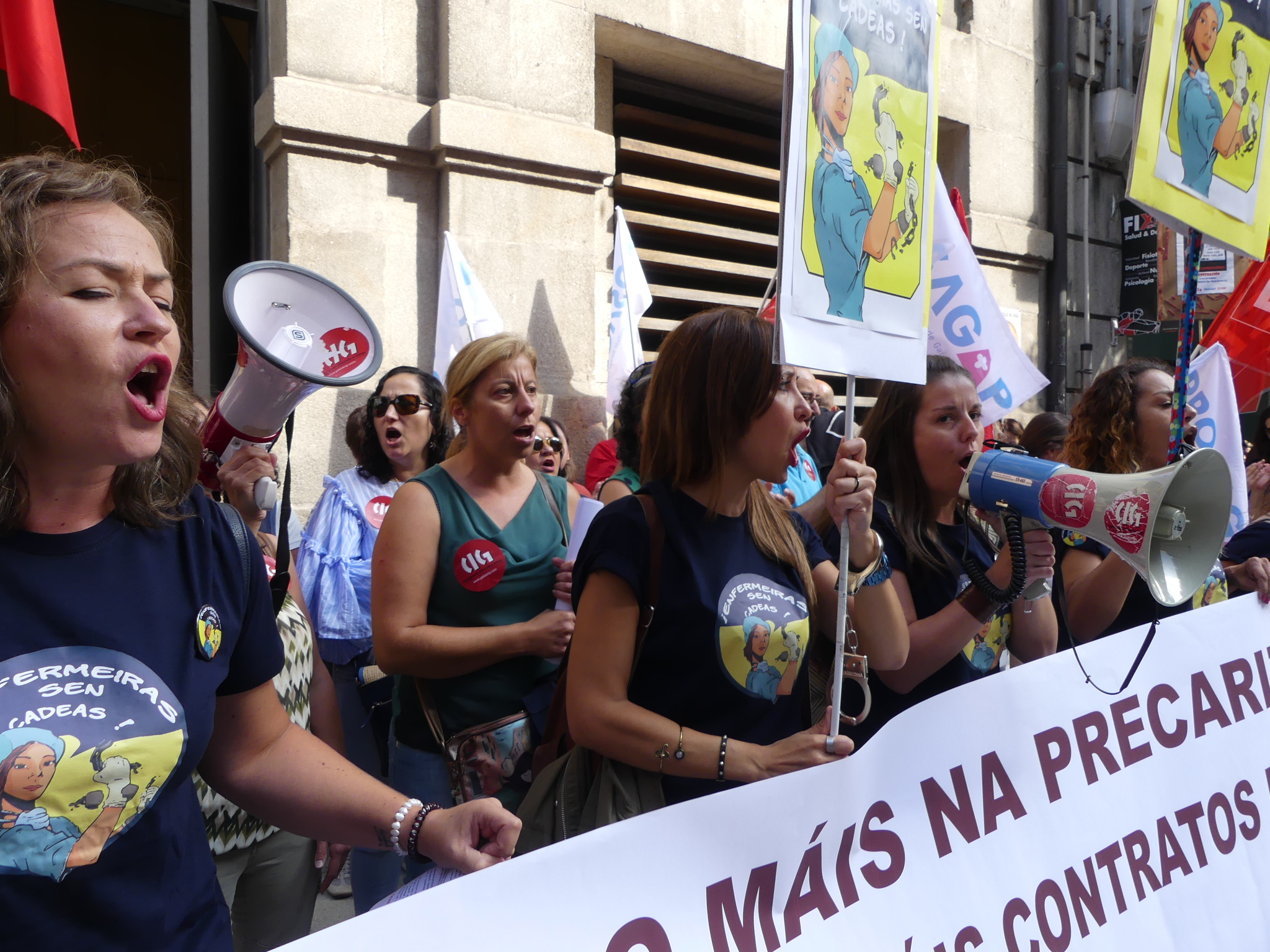 Estas foron precisamente as principais reivindicacións que trasladaron durante a mobilización desenvolvida este mediodía polo colectivo de enfermaría diante da delegación do Sergas en Vigo, onde despregaron unha faixa rexeitando “os contratos infernais” e berraron consignas en defensa dunha atención sanitaria de calidade e dunhas condicións de traballo dignas.
