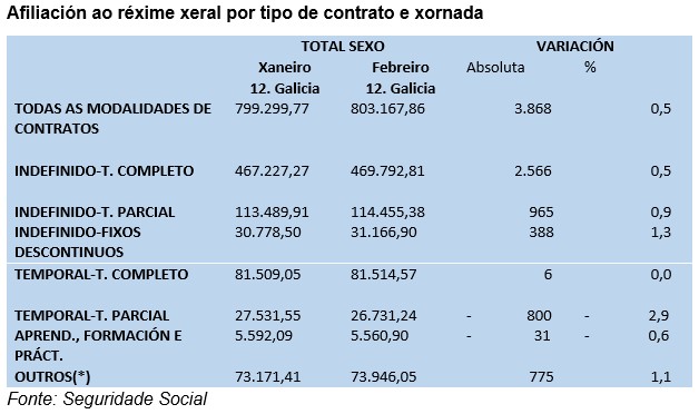Canto á afiliación á Seguridade Social, que medrou nas catro provincias, dáse a circunstancia de que os contratos que máis medran son os temporais a tempo parcial, un 2,9%, seguidos dos indefinidos fixos-descontinuos, que aumentaron o 1,3% e os indefinidos a tempo parcial, que se incrementaron un 0,9% respecto do mes de xaneiro.
