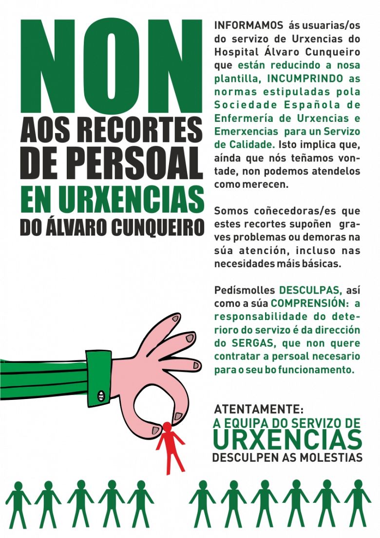 Un nutrido grupo de empregados/as do Sergas desenvolveu onte pola tarde unha concentración na entrada de Urxencias do Álvaro Cunqueiro para alertar sobre a situación na que se atopa este servizo como consecuencia da escaseza de persoal. Os profesionais sinalan que os recortes aplicados pola Xerencia están a provocar demoras e perda de calidade asistencia, polo que reclaman a substitución das baixas e un cadro de persoal axeitado para a época de picos asistenciais.