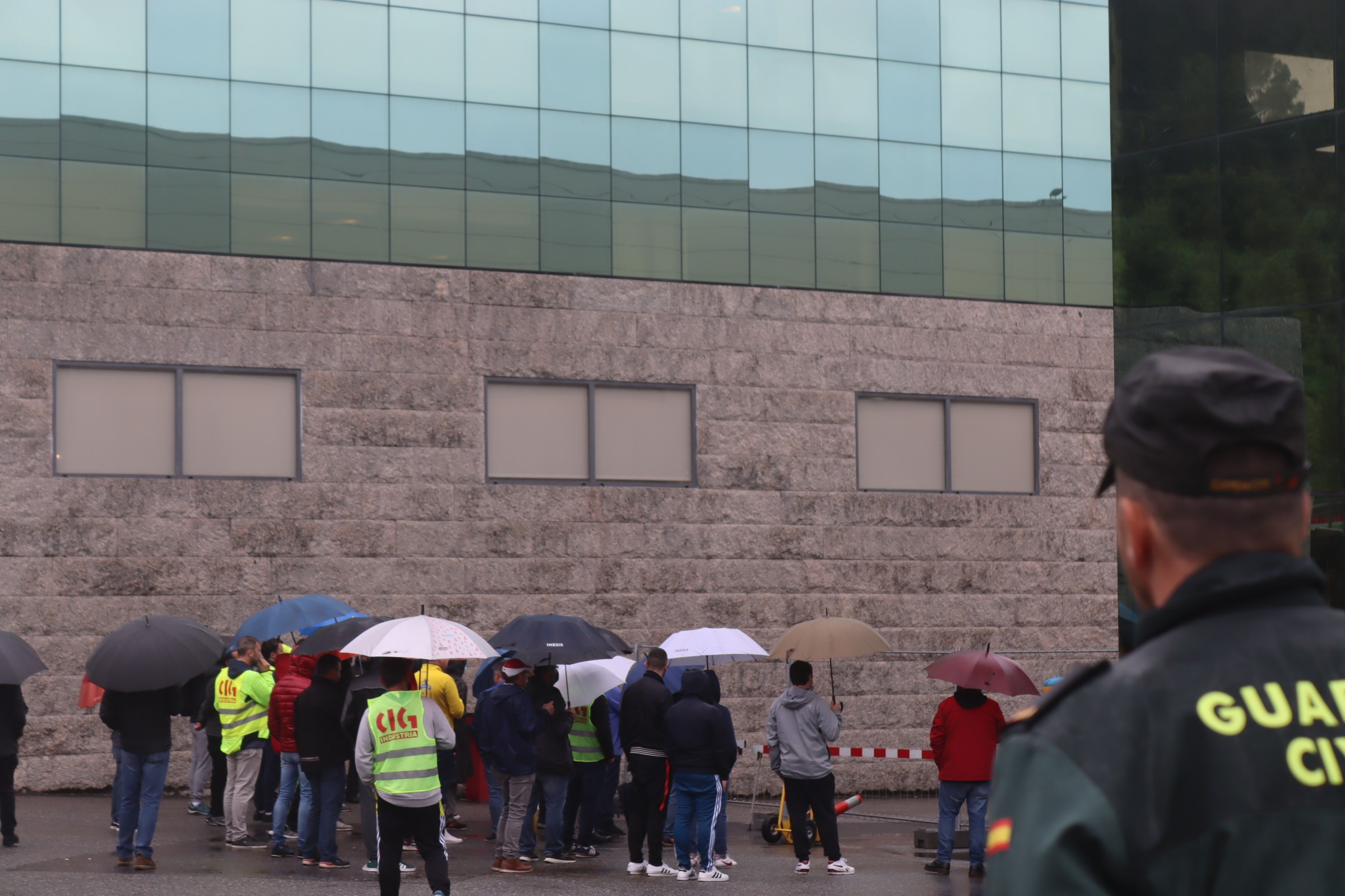 A sede estaba blindada, rodeada por un valado que impedía os accesos, custodiada por gardas de seguridade e Garda Civil. Aínda así o piquete superou o valado e traballadoras e traballadores do Metal permaneceron baixo a chuvia, durante máis dunha hora, lembrando a Cortizo e ao persoal que permanecía no interior que "estamos en folga por un convenio digno".
