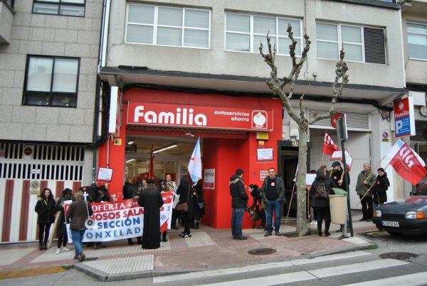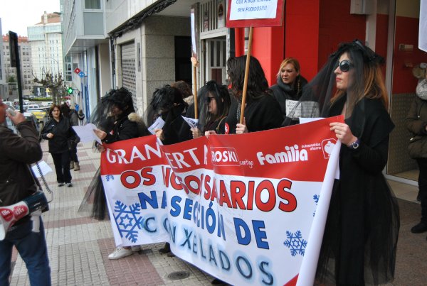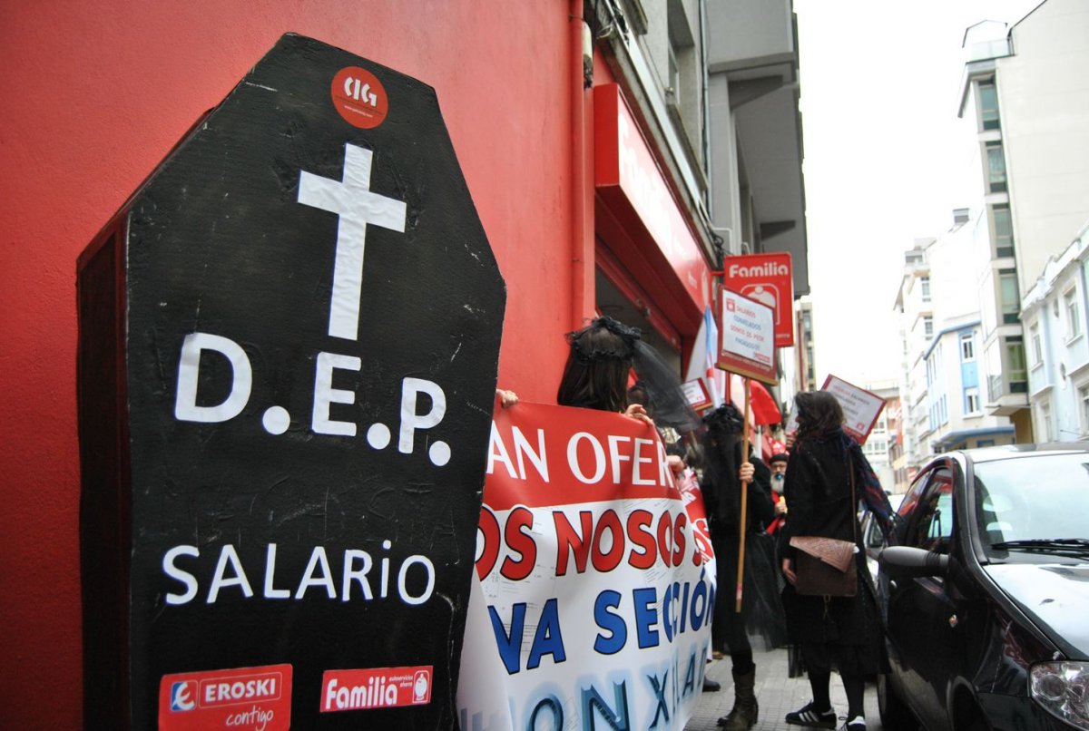 Persoal de Eroski-Familia realizou este mércores un peculiar "enterro dos salarios" na Coruña para denunciar que levan cinco anos cos soldos conxelados, a pesar de que neste período a empresa incrementou os seus beneficios un 300%.