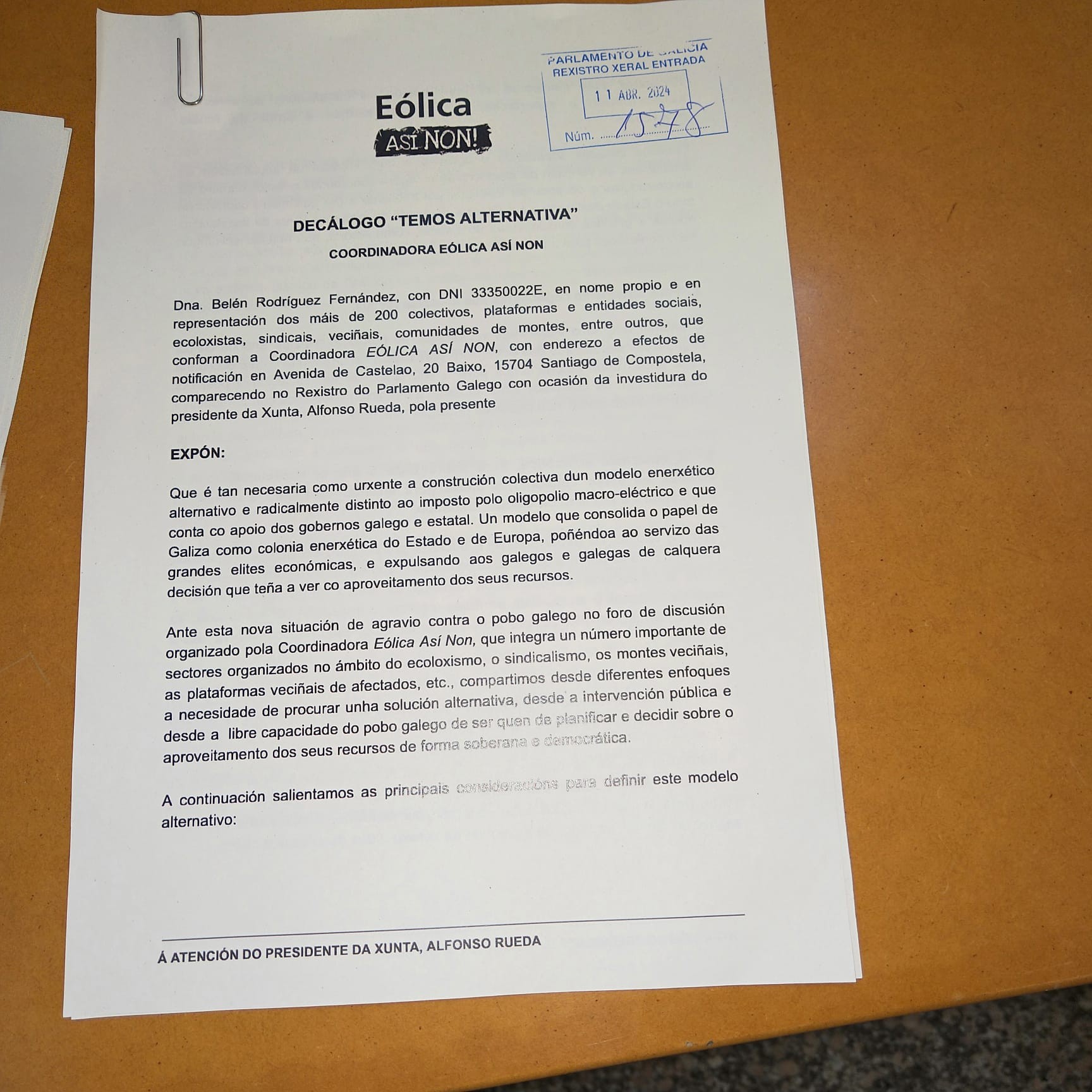 No decurso do acto, varios representantes das entidades que forman parte da Coordinadora presentaron no rexistro do Parlamento o seu decálogo de reivindicacións para un modelo enerxético xusto, sustentábel e ao servizo do pobo, que foi consensuado polos diferentes sectores sociais nas xornadas “Temos Alternativa” celebradas o pasado ano en Pontevedra.
