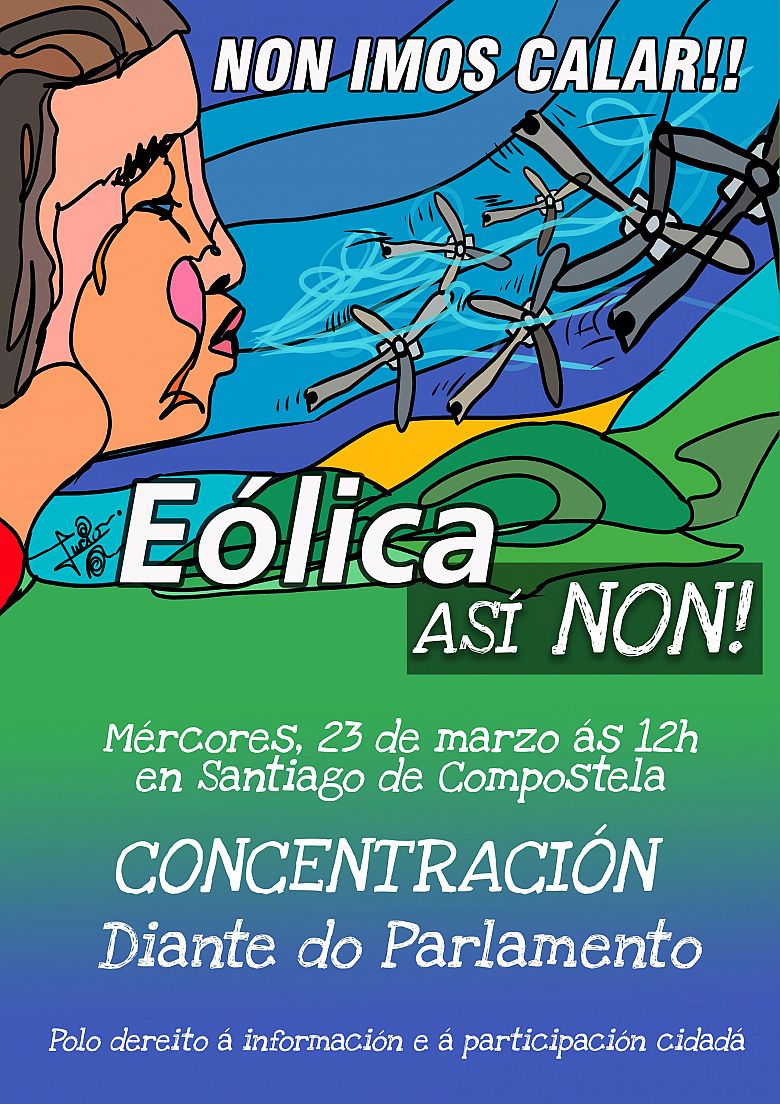 Máis de 175 entidades e colectivos de toda Galiza que conforman a Coordinadora “Eólica Así Non” convocan para o mércores, 23 de marzo, ás 12:00 horas, unha concentración diante do Parlamento de Galiza e da Valedora do Pobo, para denunciar o recorte de dereitos democráticos, promovido polo goberno da Xunta, para facilitar a autorización de proxectos eólicos e favorecer ás eléctricas.