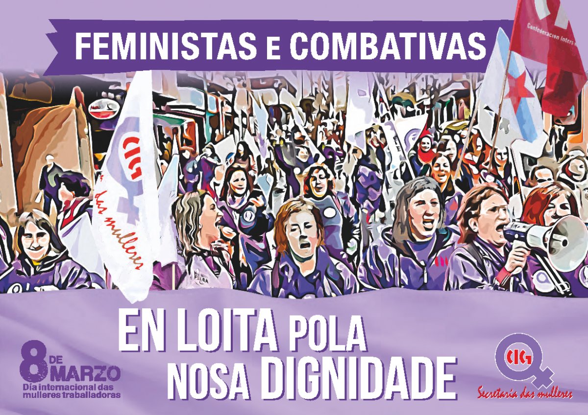 Desde o feminismo galego e de clase comprometémonos a loitar contra as discriminacións incorporando a perspectiva de xénero na nosa acción sindical, animando as mulleres traballadoras de calquera sector a afiliarse á CIG, participar nas candidaturas ás eleccións sindicais, combatendo o capitalismo, o imperialismo, o colonialismo, o machismo, o racismo e o fascismo con rebeldía.