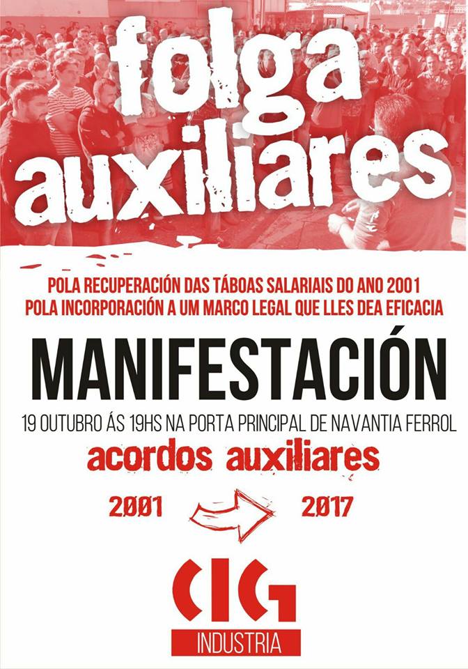 A CIG fai un chamamento a participar na manifestación convocada para este xoves, 19 de outubro, pola recuperación dos acordos salariais de 2001, súa inclusión nun marco legal que lle dea eficacia e en solidariedade coa folga que os traballadores e traballadoras das auxiliares do naval de Fene-Ferrol manteñen dende o pasado 5 de outubro por este motivo. A marcha sairá ás 19:00 horas dende a porta principal de Navantia.
