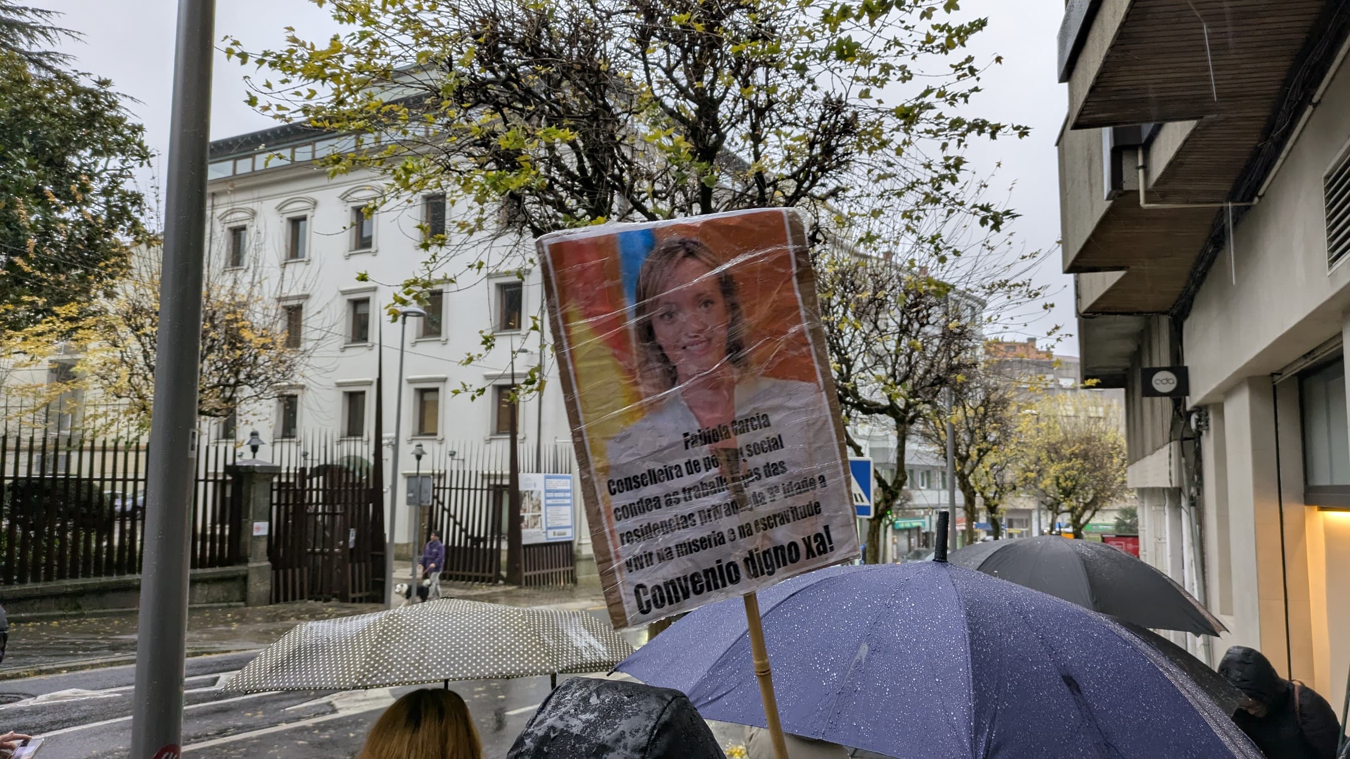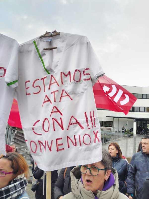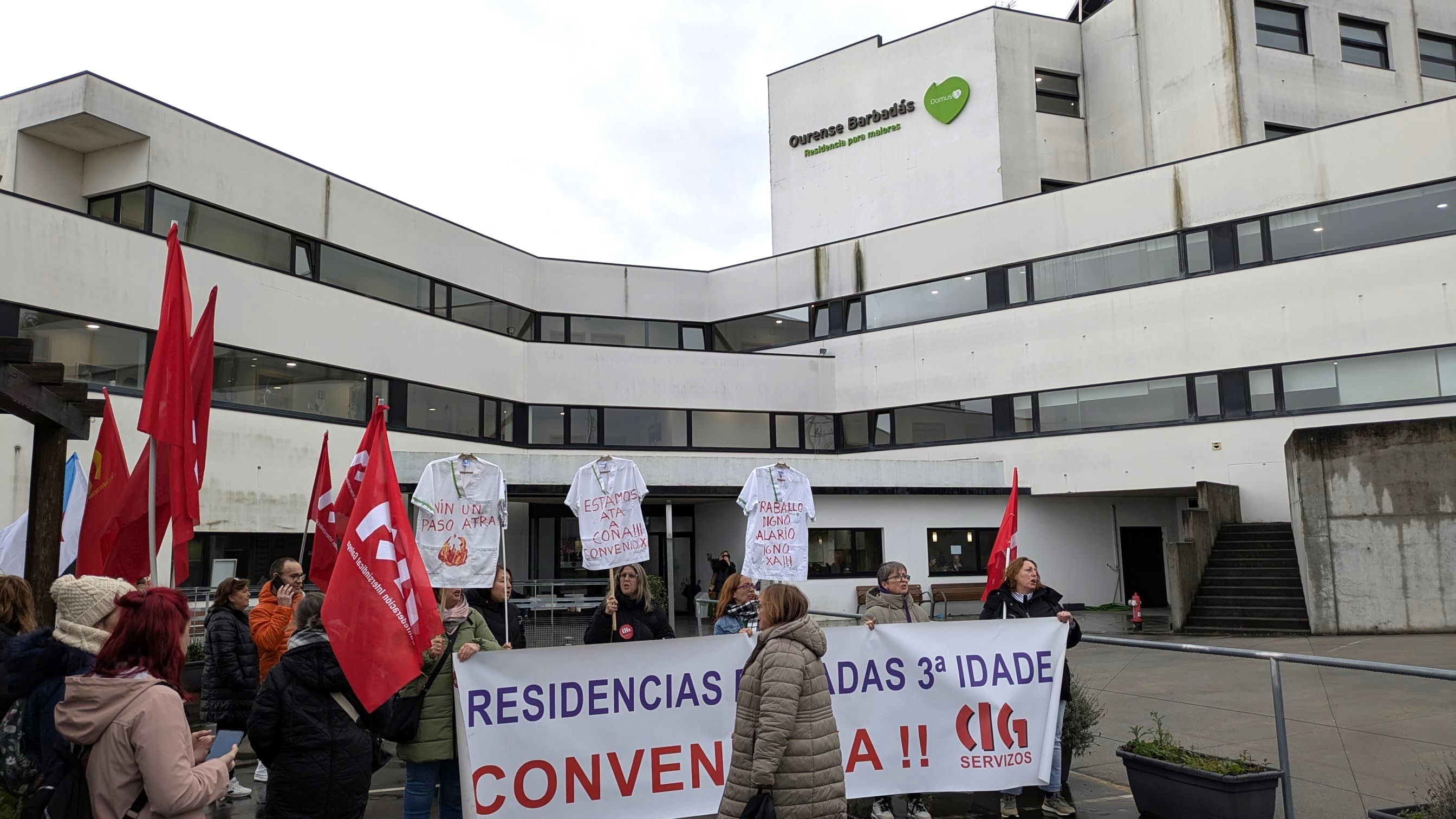 As traballadoras veñen desenvolvendo un calendario de mobilizacións para conseguir un convenio digno. De feito hoxe, ademais de concentrarse diante do Parlamento, realizaron tamén unha protesta na residencia DomusVI de Barbadás.