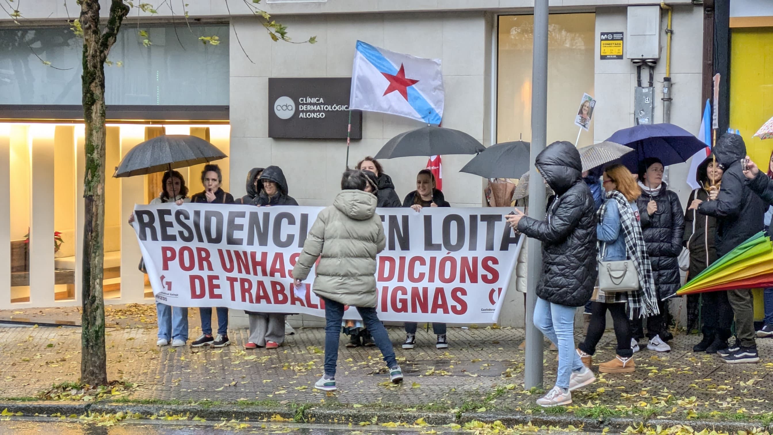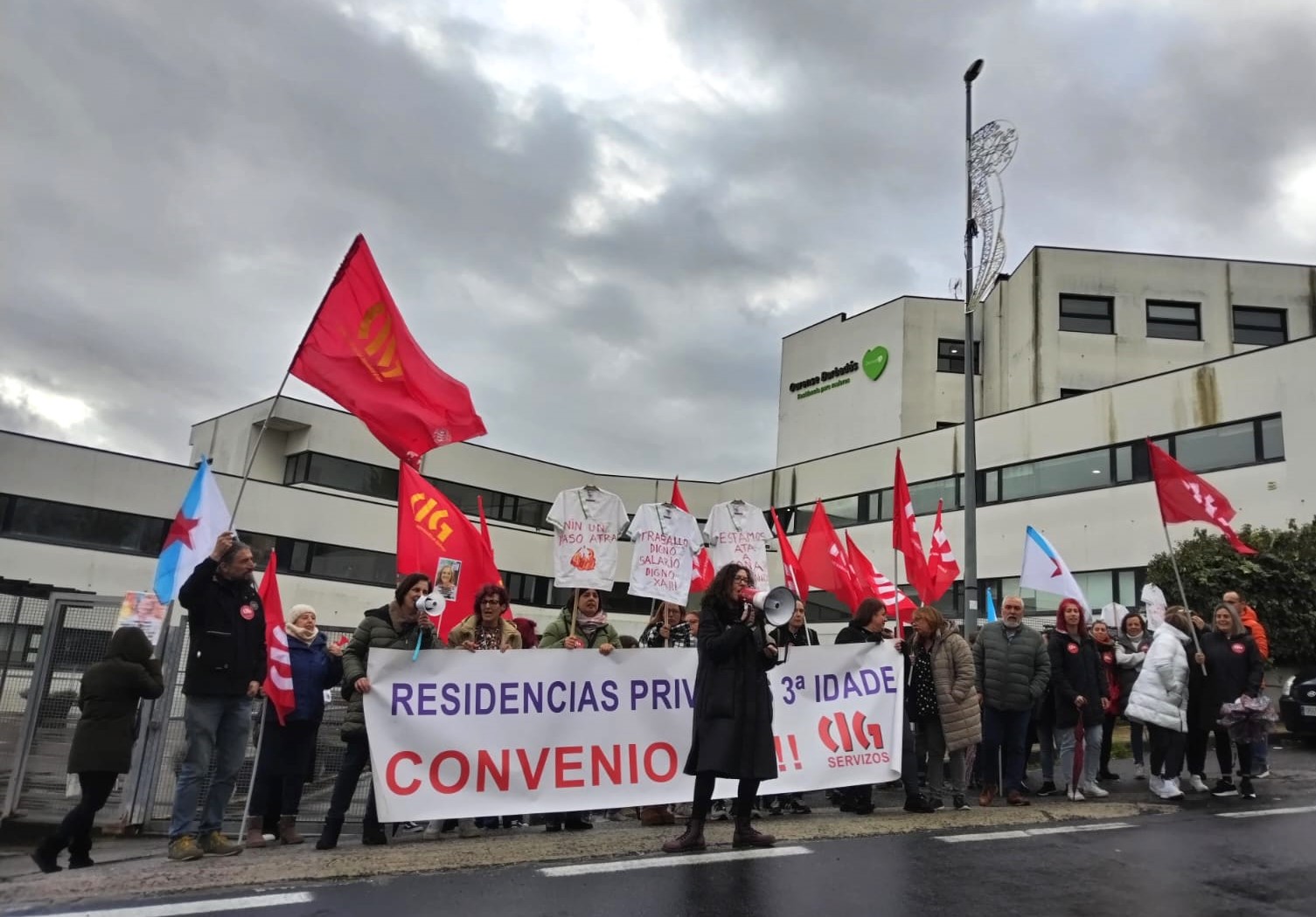Representantes das traballadoras de residencias privadas, en loita por un convenio digno, concentráronse esta tarde diante do Parlamento de Galiza coincidindo coa intervención da conselleira de Política Social, Fabiola García, en resposta á interpelación da nacionalista Olalla Rodil. A CIG denuncia que a conselleira eludiu toda responsabilidade abandonando “á súa sorte” ao persoal destes centros.