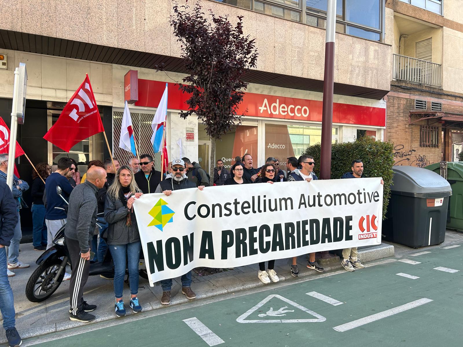 Traballadores/as de Constellium Automotive, empresa do sector da automoción con sede no Porriño, mobilizáronse hoxe diante da ETT Adecco en Vigo para denunciar a vulneración do dereito de folga mediante a contratación de persoal externo. O comité (integrado por cinco delegados/as da CIG) detectou cando menos seis casos (tres por quenda), que puxo en coñecemento da Inspección de Traballo.