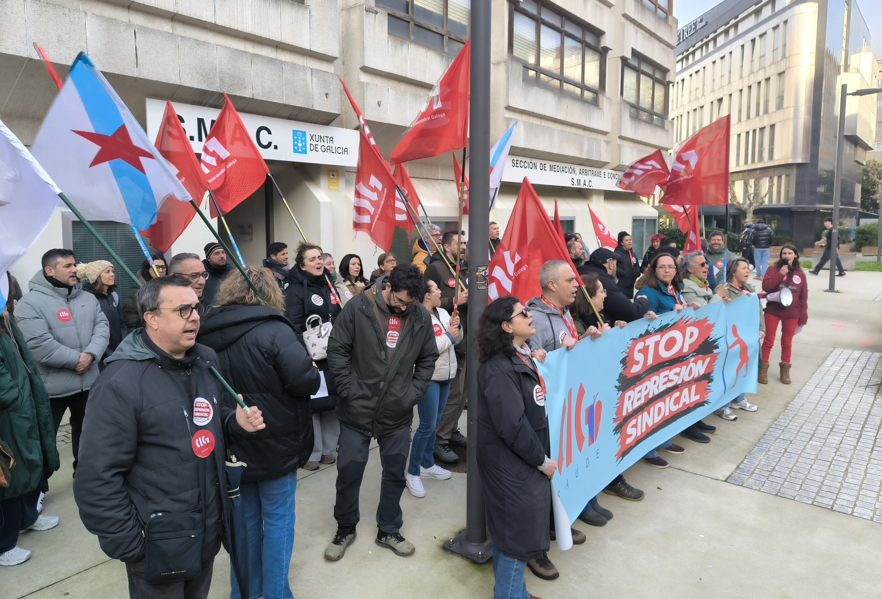 A CIG desenvolveu unha concentración este xoves diante do SMAC da Coruña contra a política de persecución e represión sindical exercida polo Hospital Quirón. A protesta realizouse coincidindo co acto de conciliación polas sancións impostas á presidenta e ao secretario do comité, a quen ademais a empresa despediu, mentres estaba de baixa, alegando motivos disciplinarios por supostos incumprimentos en materia de protección de datos.