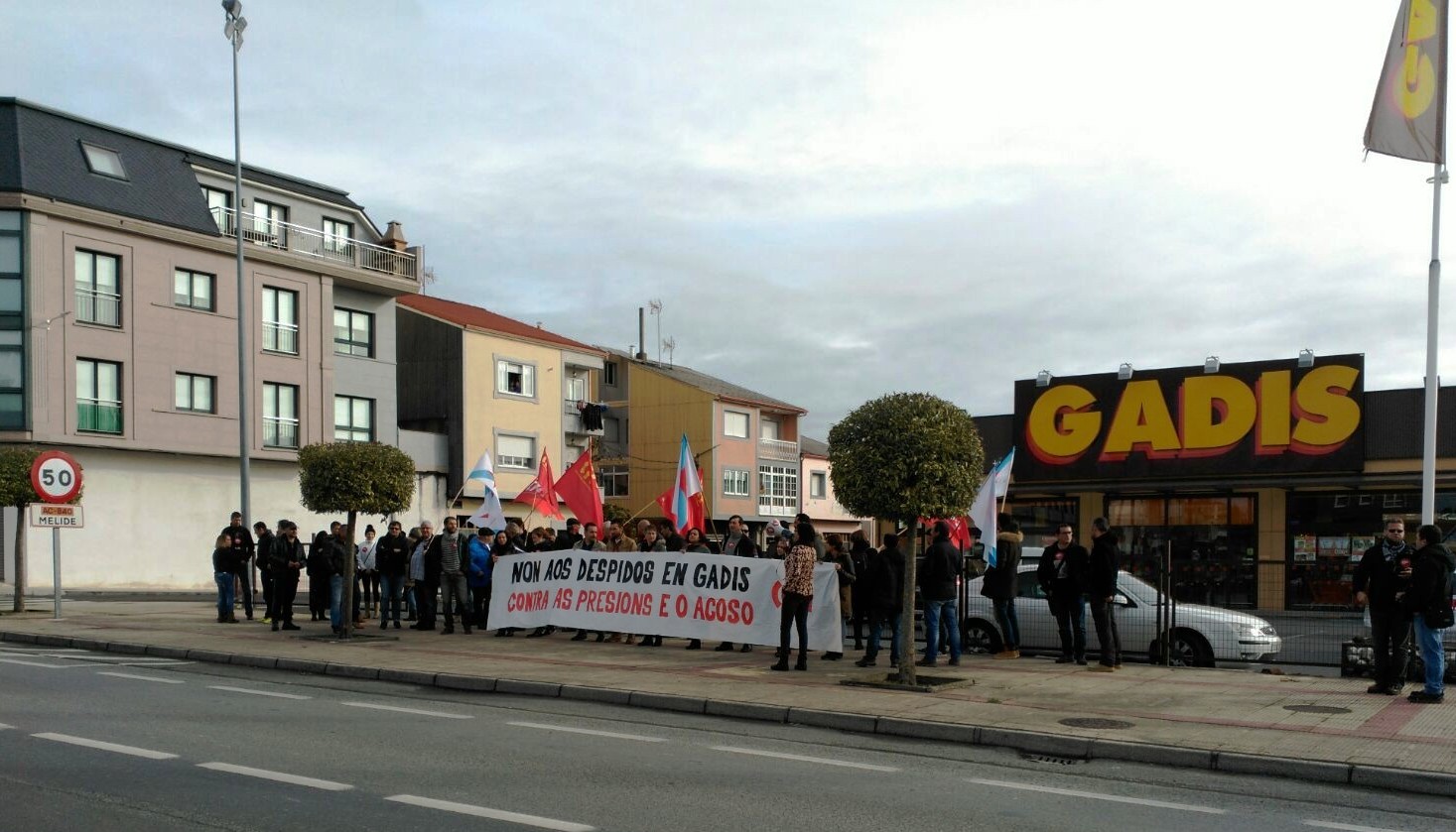 Traballadores/as de Gadis acompañados por compañeiros/as da CIG-Servizos concentráronse esta mañá diante do supermercado que a empresa de alimentación ten en Melide para denunciar o despedimento dun traballador mentres estaba de baixa por IT e reclamar a súa readmisión.