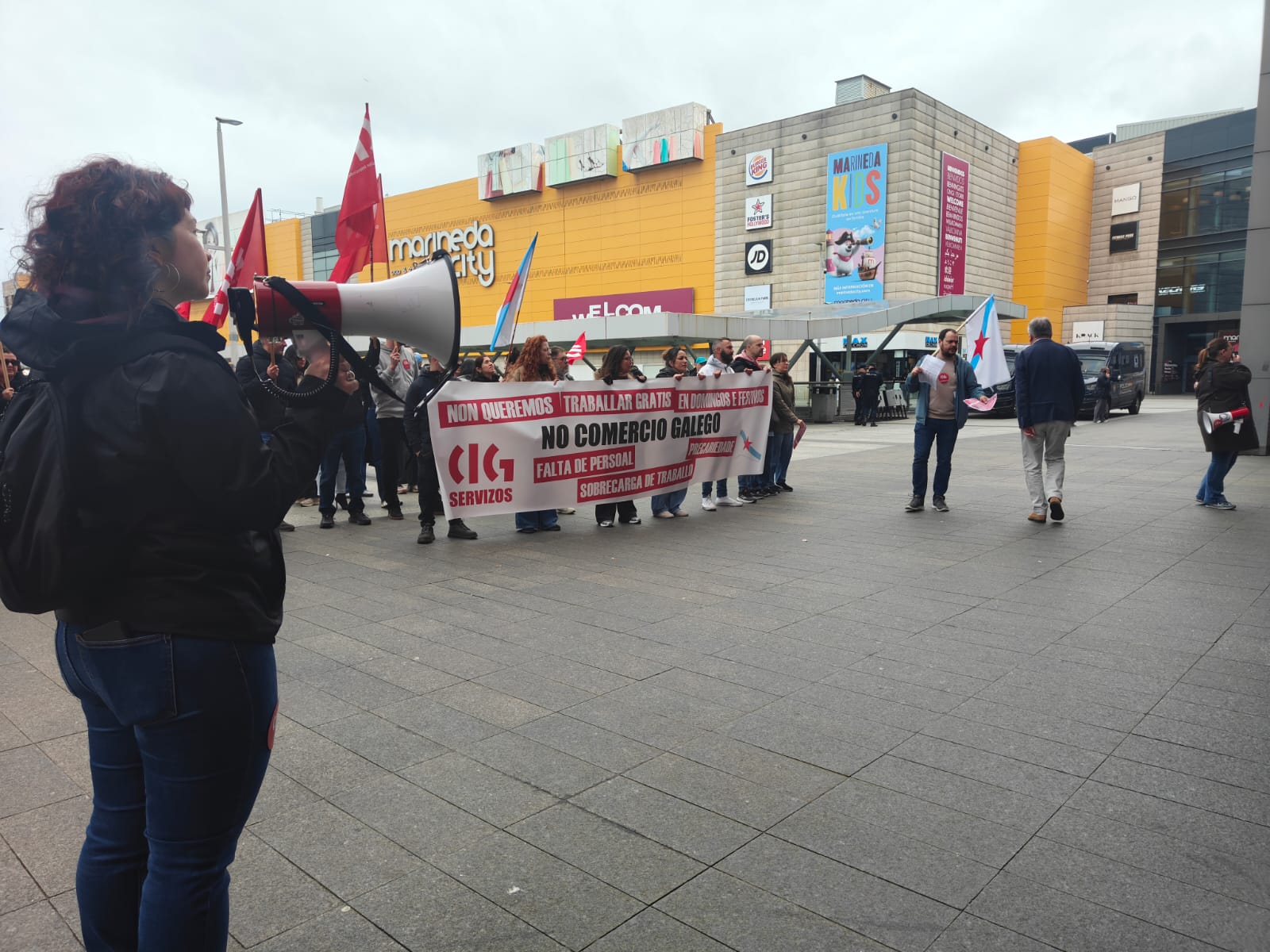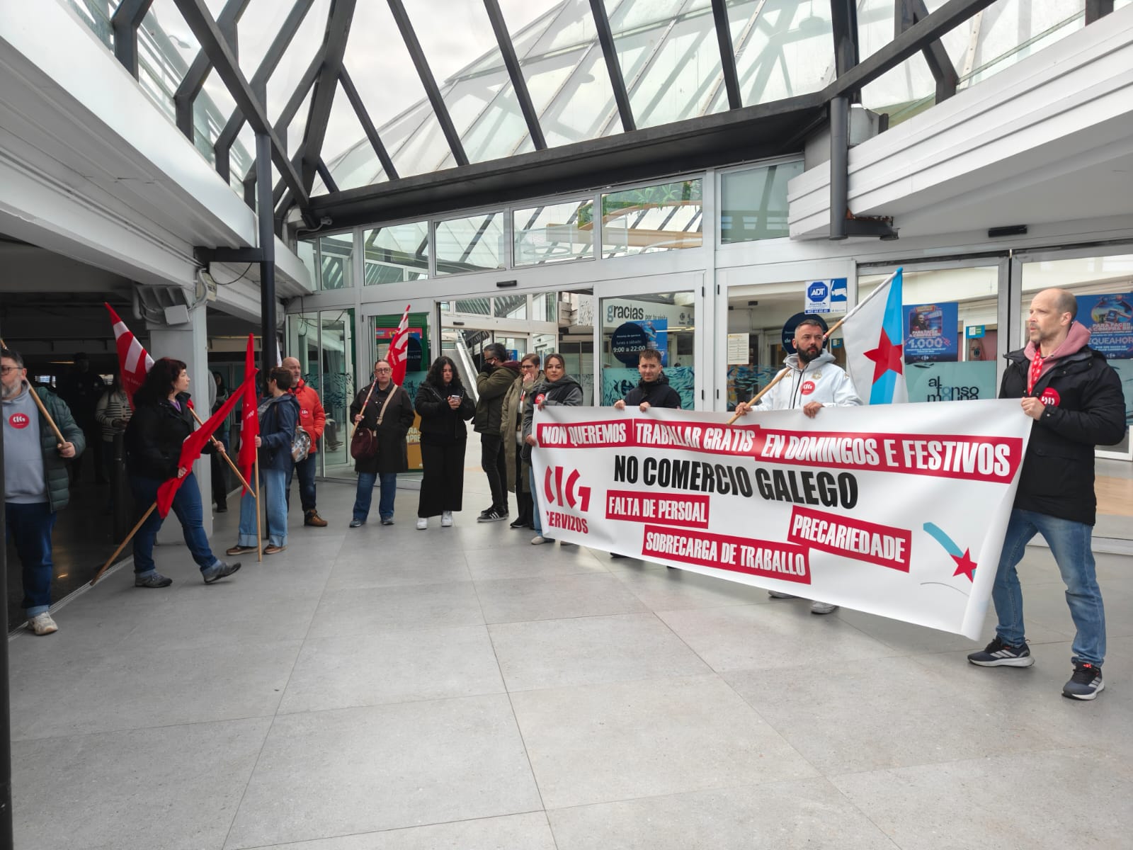 O persoal dos grandes almacéns galegos secunda este xoves, día festivo de apertura, a primeira xornada de folga de 24 horas convocada neste sector, contra a precariedade, a falta de persoal e a sobrecarga de traballo e en defensa de condicións laborais dignas e salarios xustos.