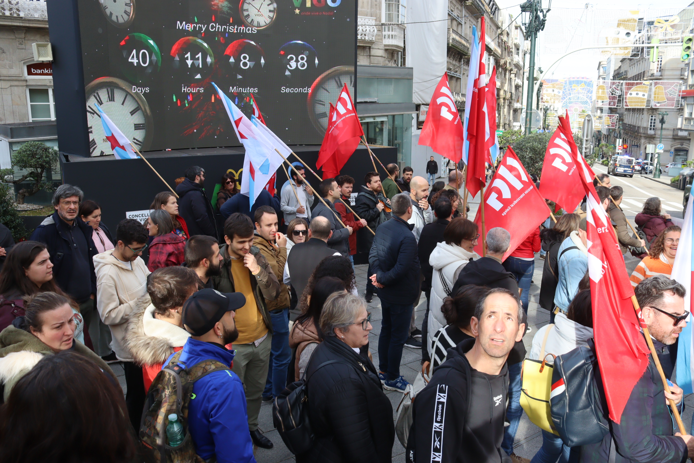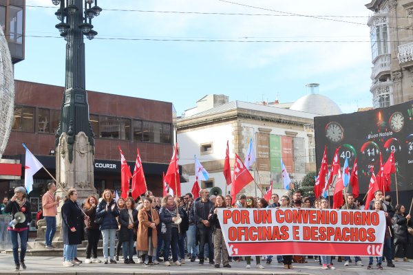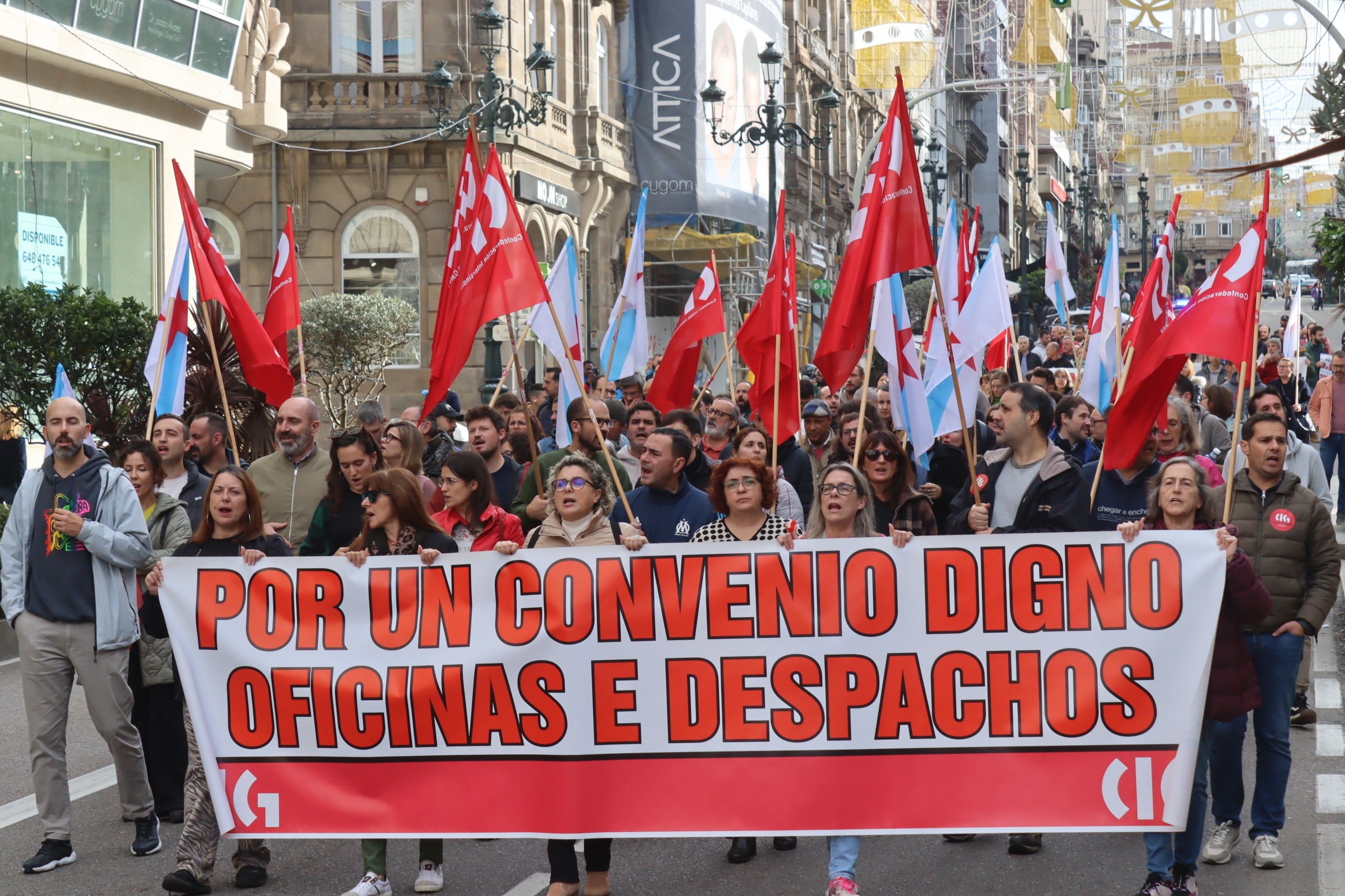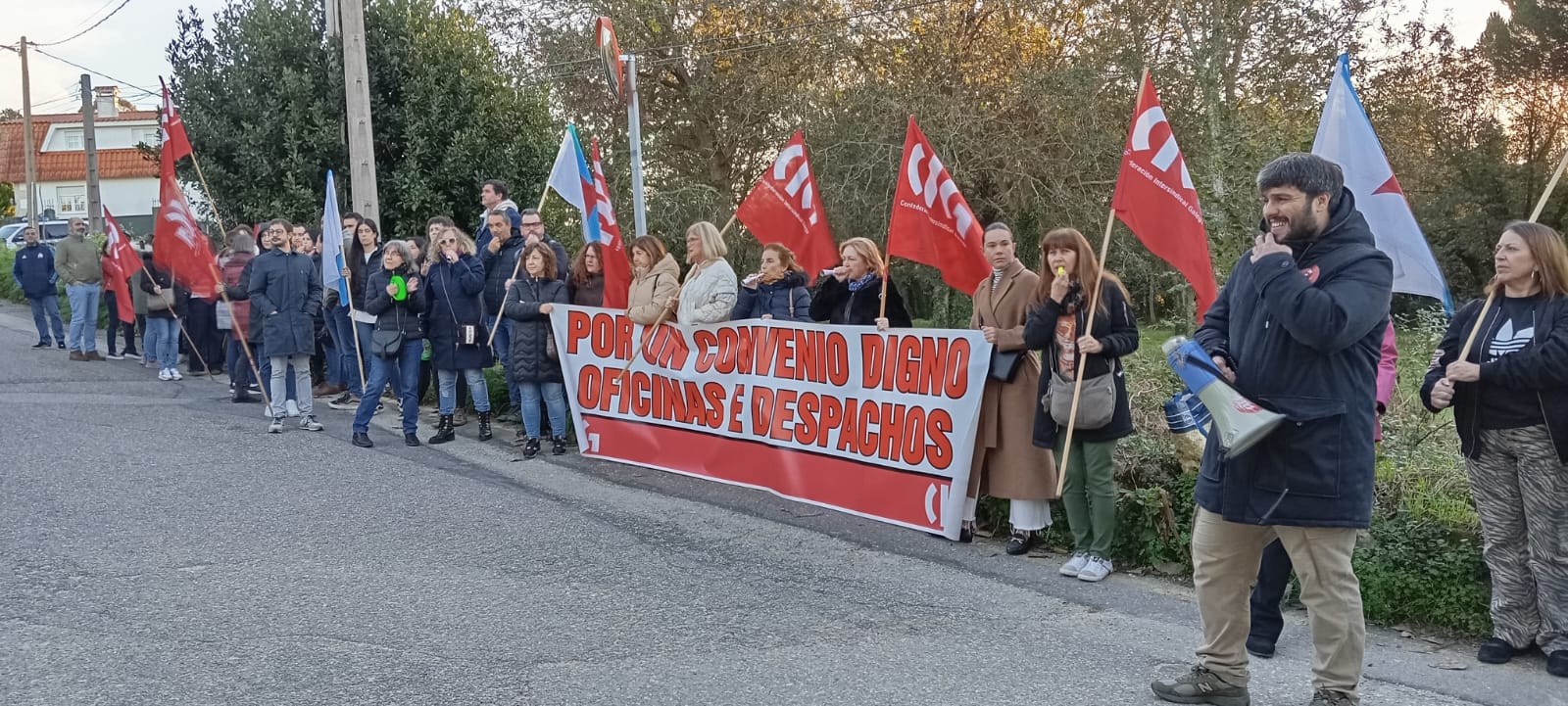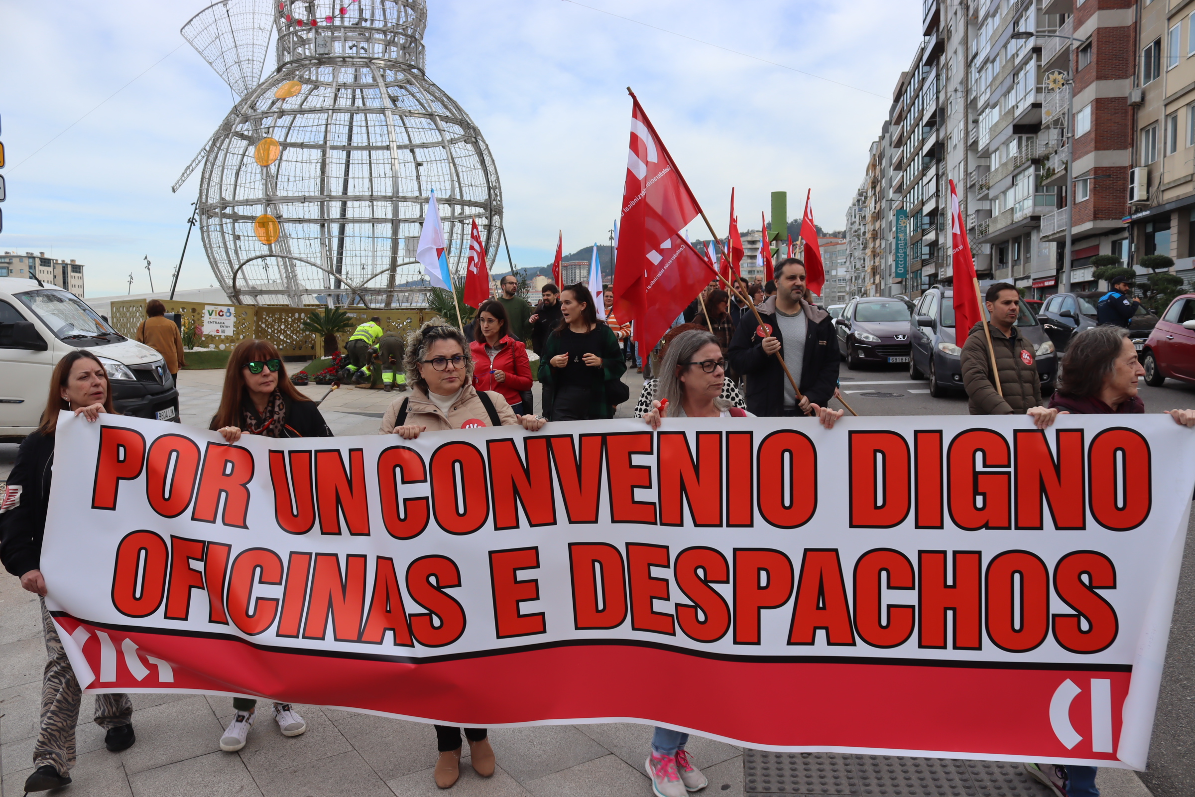 O persoal de oficinas e despachos da provincia de Pontevedra protagonizou hoxe unha intensa mañá de mobilizacións en Vigo e Nigrán coincidindo cunha nova xornada de folga convocada pola CIG no sector para reclamar un convenio colectivo digno.