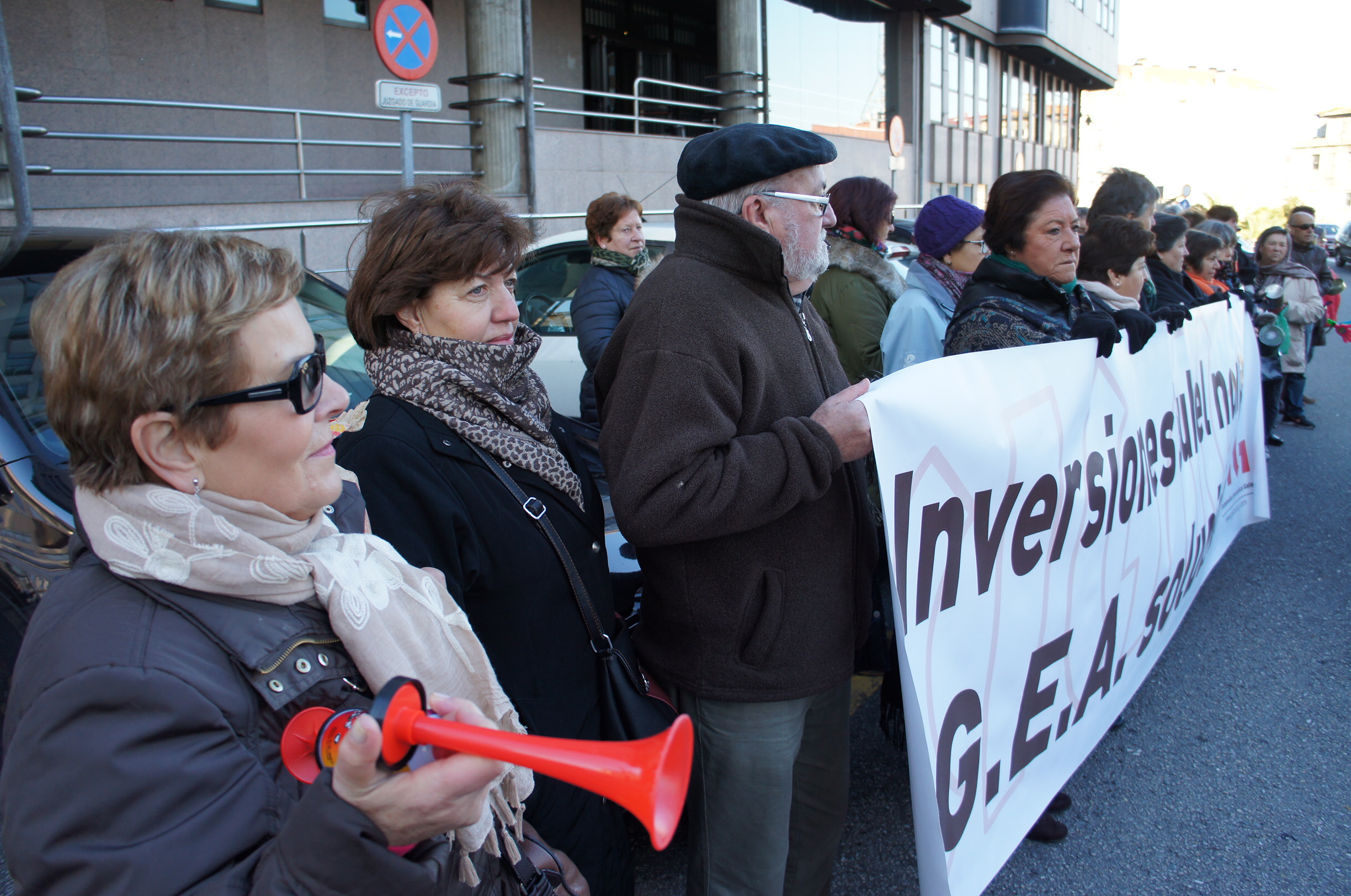 As ex traballadoras/es comezaron unha ruidosa protesta diante dos Xulgados da rúa Lalín pouco despois das dez da mañá, onde permaneceron arredor dunha hora facendo soar bucinas e cacharros e despregaron unha faixa na que se podía ler “Inversiones Subel non paga. GEA solución”.