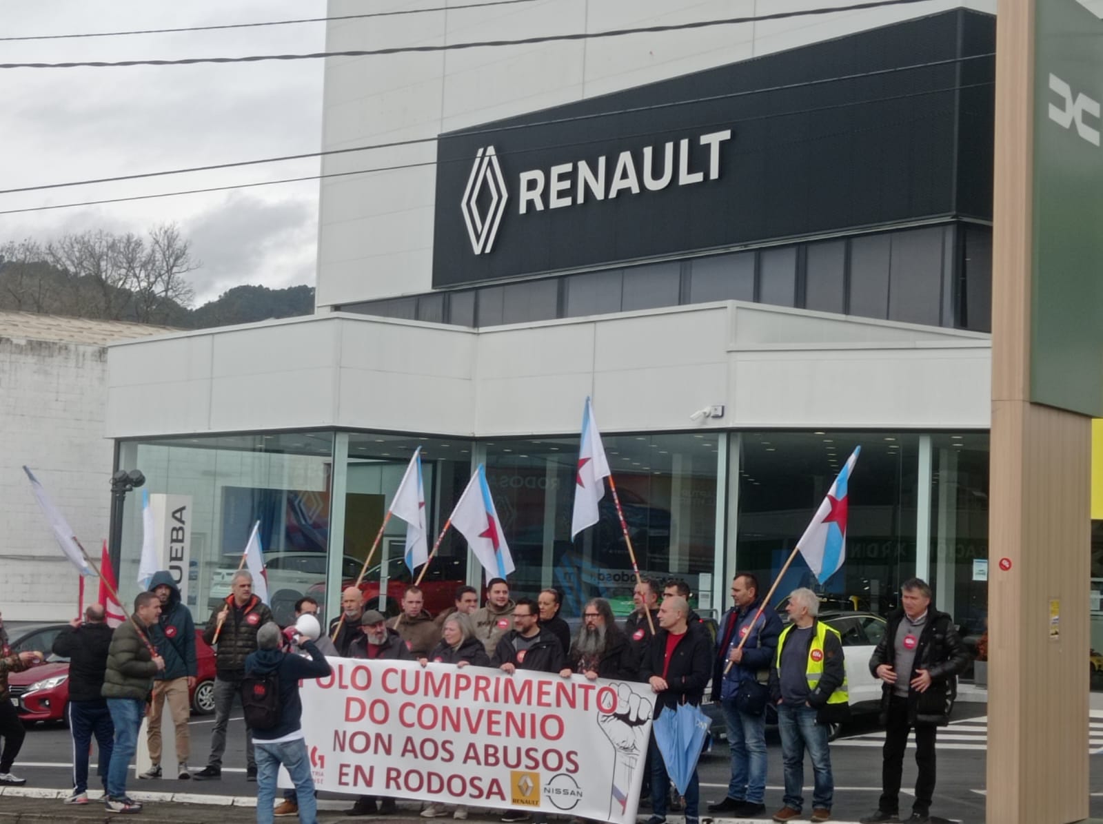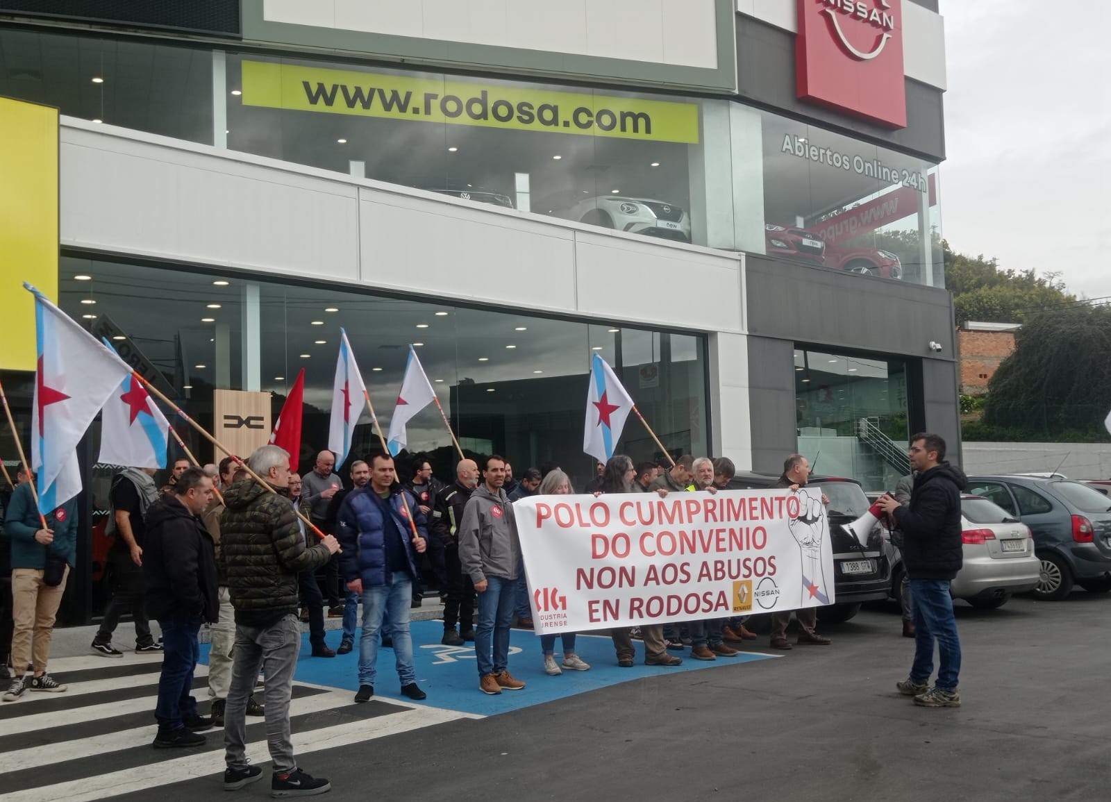 A concentración diante das instalacións da empresa Rodosa desenvolveuse de 11:30 a 12:30 horas para denunciar o incumprimento sistemático do convenio provincial do siderometal por parte de Rodosa, xa que o cadro de persoal ten que traballar os sábado pola mañá. Ademais, a compañía con sede na estrada de Vigo despediu recentemente unha traballadora por causas obxectivos, aínda que finalmente a rescisión de contrato foi considerada improcedente polo Xulgado do Social.