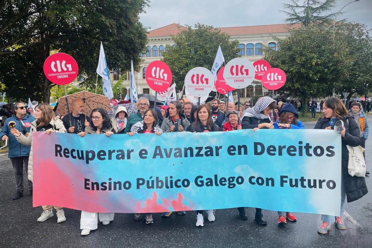 Segundo explicou Laura Arroxo, secretaria nacional da CIG-Ensino, a organización maioritaria dentro do sector, “démoslle a volta á Consellaría porque o que se pretende é que esta lle dea a volta ás súas políticas e se poña do lado do profesorado, invista máis no público e non nas empresas privadas, aumente o número de docentes e non a burocracia, reduza o horario e as ratios e non recorte a nosa liberdade de cátedra como pretende”.